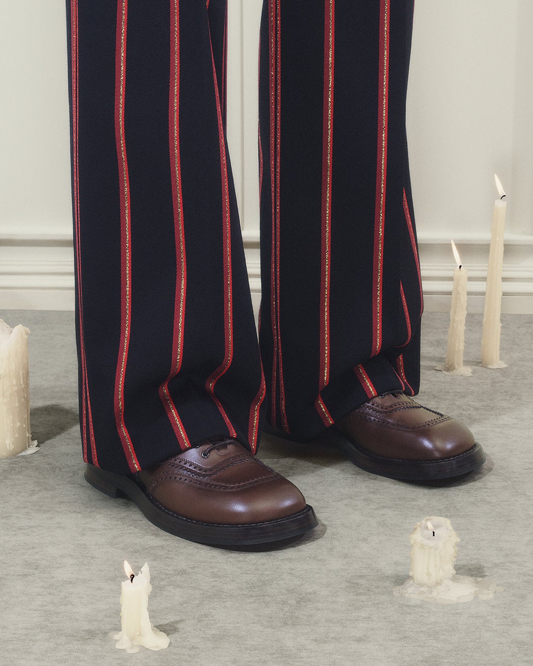 シューズとアクセサリーは、きらめくメタリックレザーで表現。触り心地の良いシルバーのTバースリングバッグ、バロックゴールドのブローグチェルシーブーツ。キラキラと輝く新しいフレアプラットフォームは、洗練されたTバーアンクレットで仕上げられています。