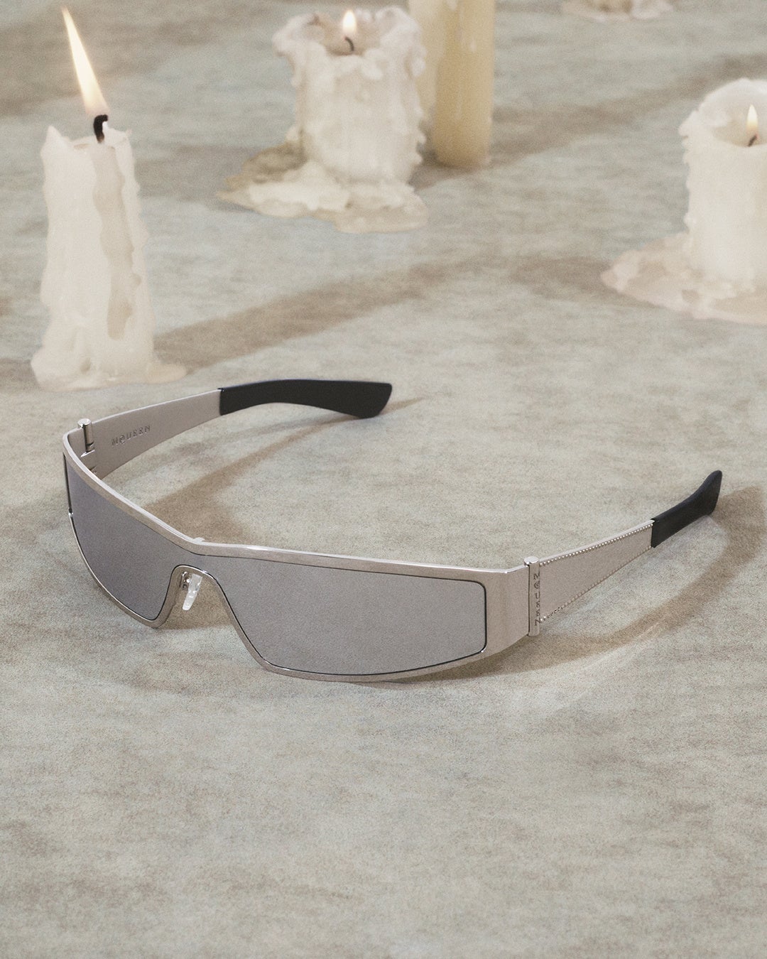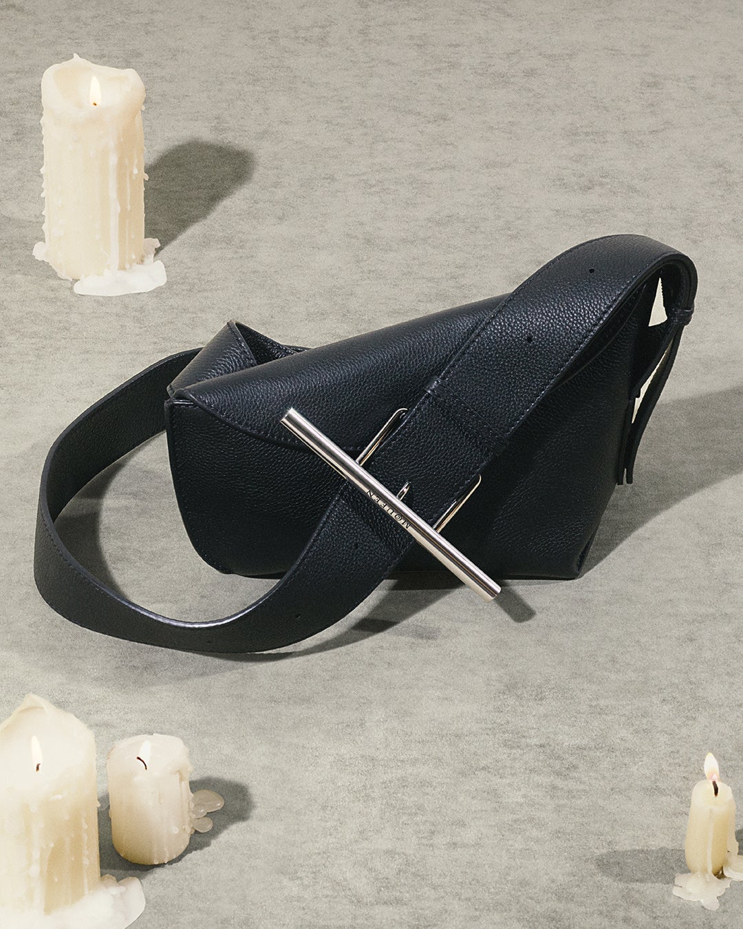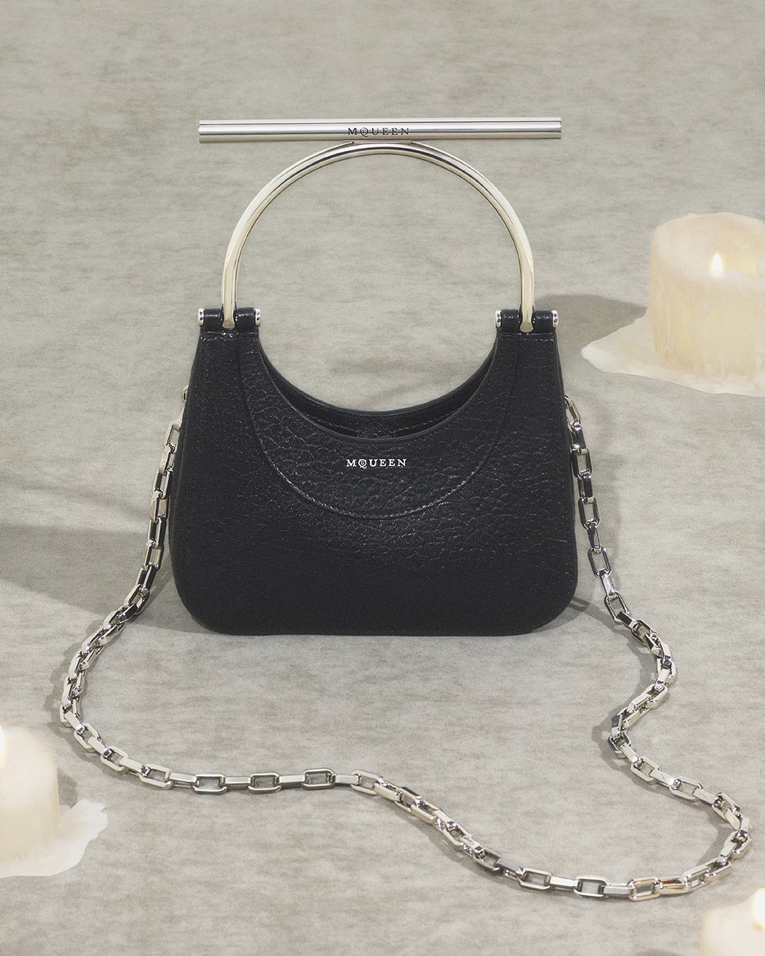 彫刻的なシルエットに光を反射するラグジュアリーな装飾を施し、マックイーンのシグネチャーハードウェアで仕上げました。
