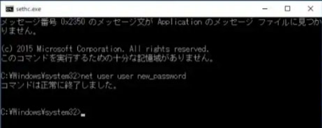 Step4:コマンドプロンプトが起動しますので「C:¥Windows¥System32> net user administrator /active:yes」を入力して「Enter」キーを押します。続いて、「net user ユーザー名 新しいパスワード」を入力して実行します。