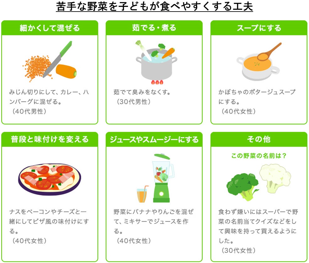 細かく刻んで混ぜたり、スープにしたりなど、家庭ごとに様々な調理法で工夫を凝らしていることが分かりました。また、中には調理法ではなく、クイズなどで野菜に興味を持たせて、苦手な野菜を食べてもらえるようにしている家庭もありました。