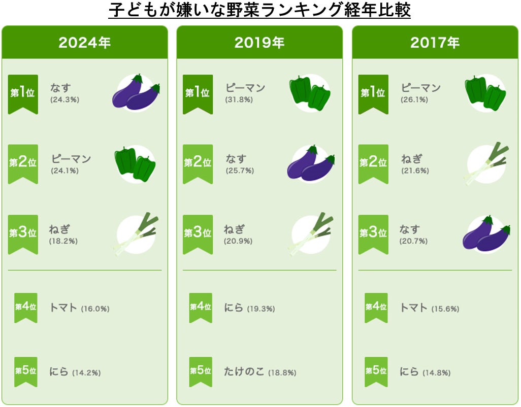 一方で嫌いな野菜ランキングの結果を比較すると、過去の調査では2017年、2019年ともに第1位が「ピーマン」なのに対して、今年は初めて「なす」が僅差で1位の結果でした。