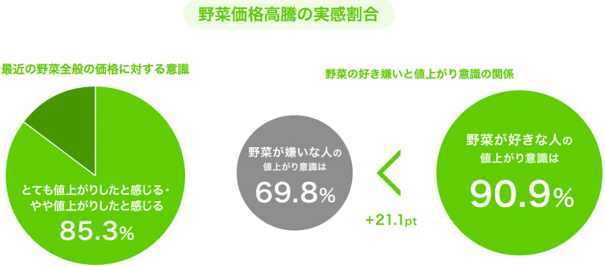 野菜の価格高騰に関する調査では85.3%もの人が野菜の価格高騰を実感していることが分かりました。また、野菜の価格について値上がりを感じると回答した割合は、野菜好きが90.9%なのに対し、野菜嫌いは69.8%でした。野菜が好きな人の方が、より野菜の値上がりを実感しているという結果となりました。