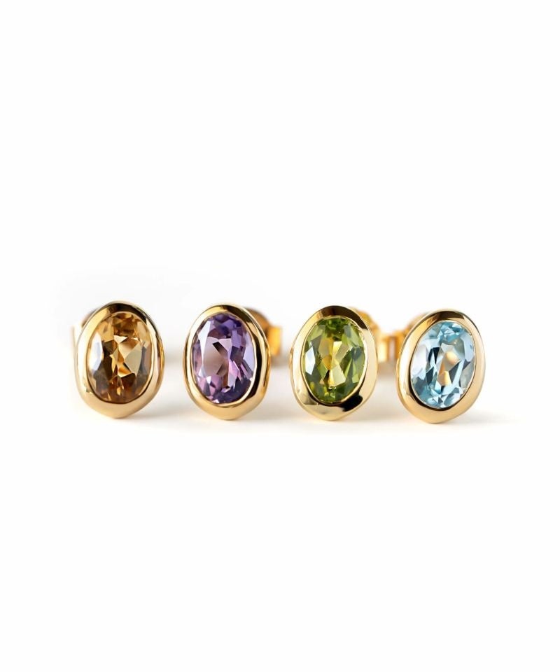 オーバルカットが美しく際立つ、上品な天然石ピアス。程よいサイズ感で、耳元にさりげない華やかさをプラス。厚メッキ加工で、ゴールドの輝きが長持ち。ペリドット、スカイブルートパーズ、シトリン、アメジストと、それぞれの誕生石が持つ魅力を楽しめる、お守りジュエリーとしても最適な一品です。