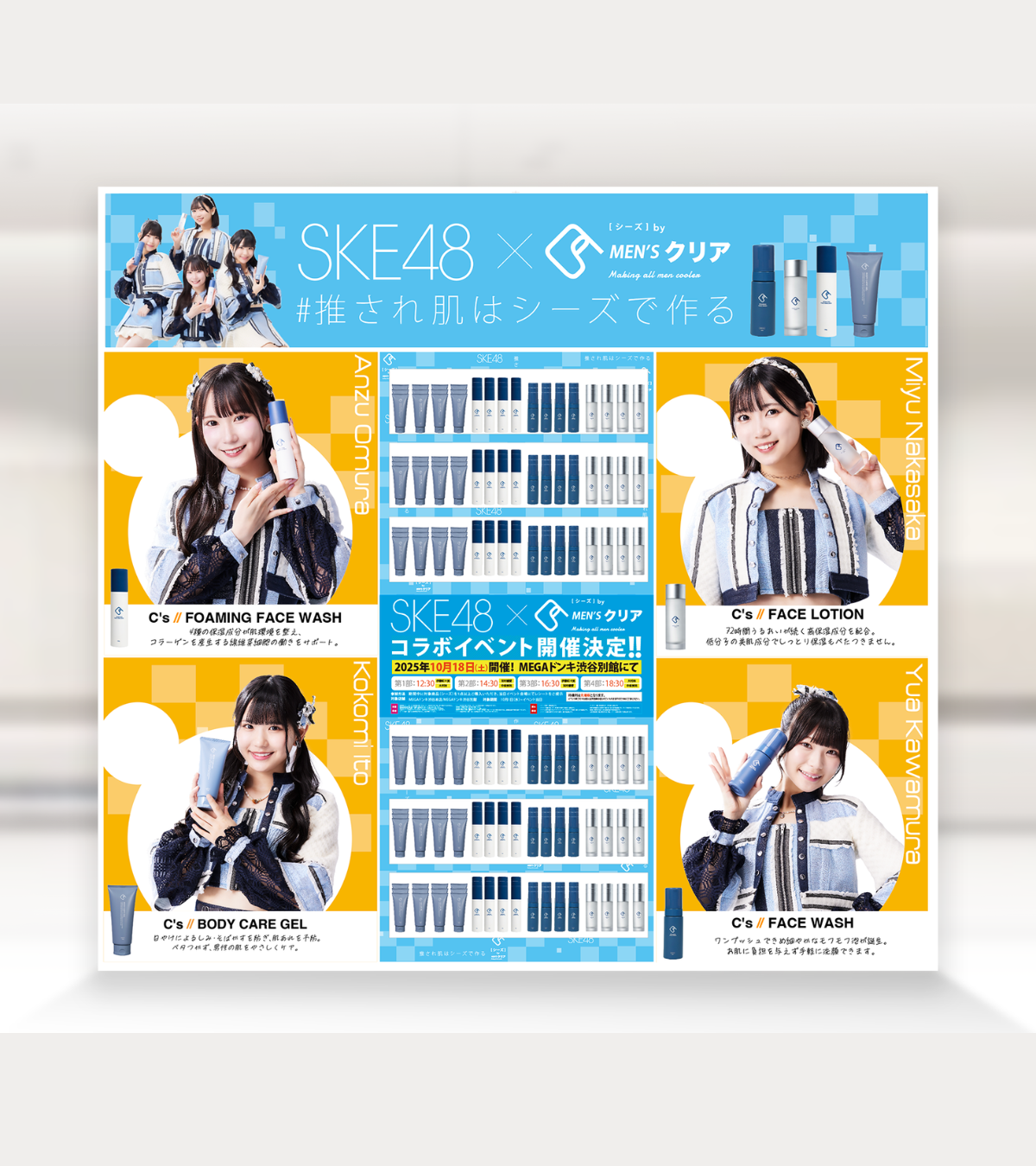 10月6日(月)~19日(日)の期間、MEGAドンキ渋谷別館1Fに特設ブースを設置します。高さ約3メートルの大型パネルやSKE48メンバー直筆サインを展示し、来場者だけが楽しめる特別な空間を演出。さらに、C’s(シーズ)の化粧水・乳液・洗顔・ボディジェルを実際に手に取れる商品展示も行います。コラボデザインで彩られた空間は、まるでミニギャラリーのようにお楽しみいただけます。