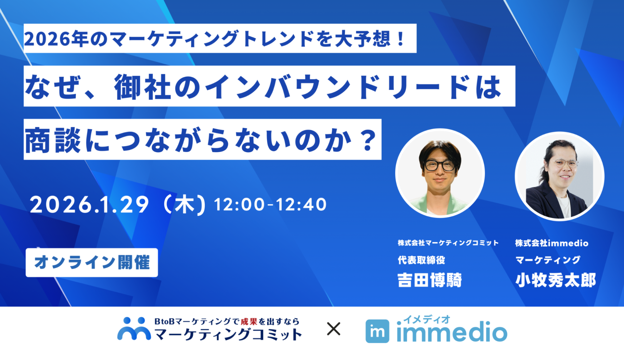 株式会社immedio(本社:東京都渋谷区、代表取締役:浜田 英揮)は、2026年1月29日(木)に、株式会社マーケティングコミット(本社:東京都新宿区、代表取締役:吉田 博騎)と共同でウェビナー「2026年のマーケティングトレンドを大予想!なぜ、御社のインバウンドリードは商談につながらないのか」を開催することをお知らせいたします。