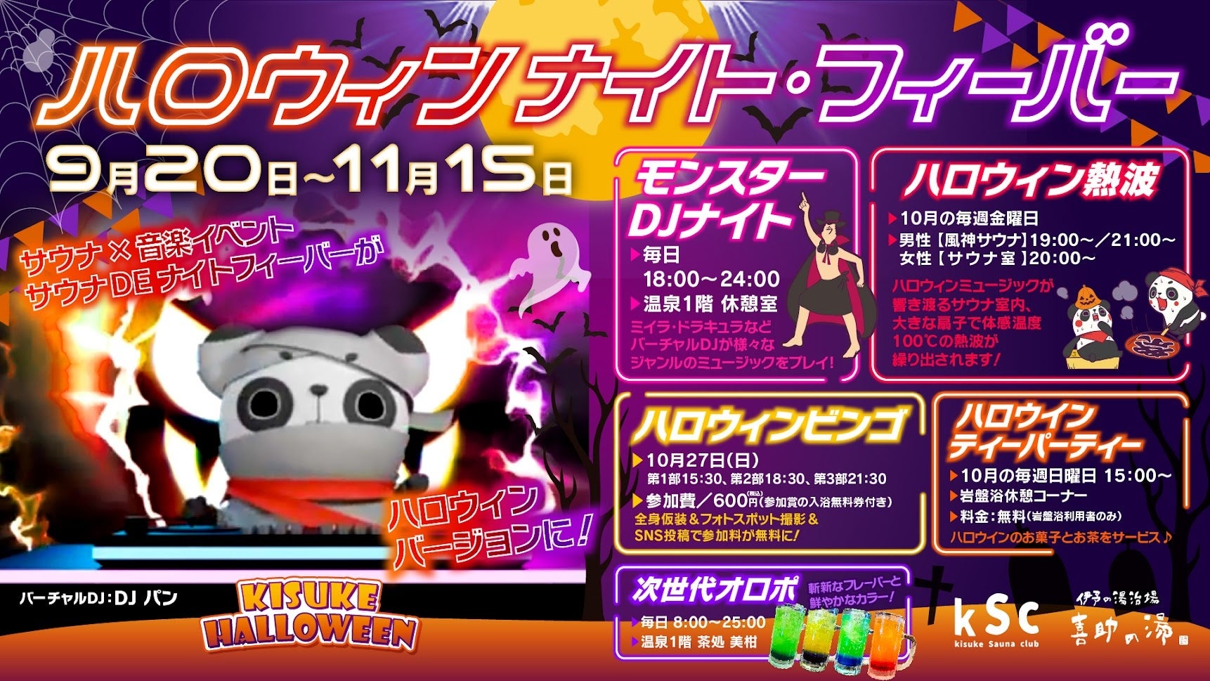 「伊予の湯治場 喜助の湯」では、2024年9月20日から11月15日までの期間限定で、「ハロウィンナイト・フィーバー」イベントを開催いたします!今年のハロウィンは、ただの温泉ではなく、サウナと音楽の融合で特別な体験が待っています。温泉1階の休憩室では、毎日18時から24時までの間、バーチャルDJ「DJパン」が様々なジャンルの音楽をお届けする「モンスターDJナイト」を実施。音楽を楽しみながら、リラックスした時間をお過ごしいただけます。