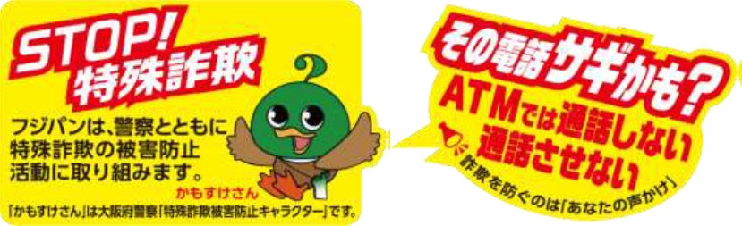 大阪府警察特殊詐欺被害防止キャラクター「かもすけさん」の、大阪府警察コラボの特別パッケージとなっています。特殊詐欺の被害を防止するために、ATMでの通話の注意喚起も載せ、特殊詐欺の被害防止活動の周知に協力させていただきます。