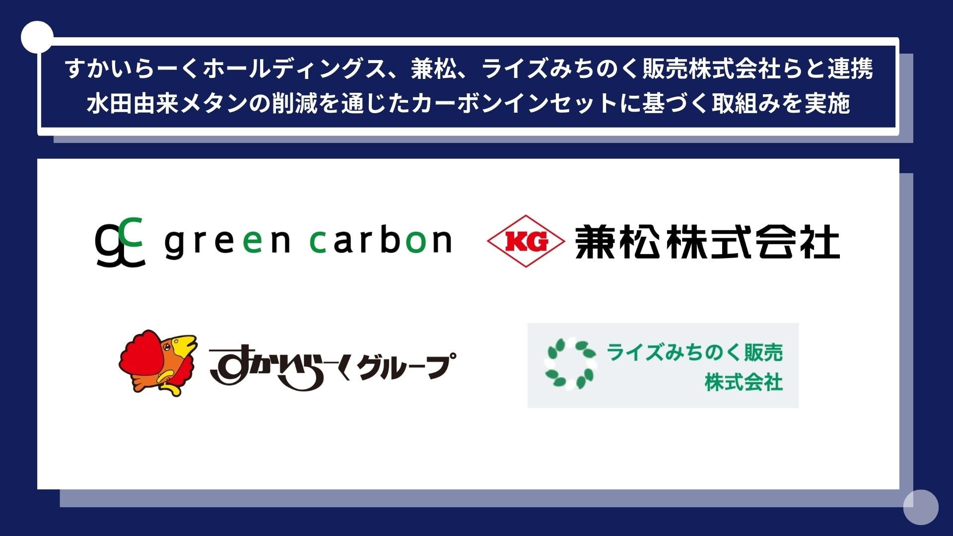 Green Carbon株式会社は、株式会社すかいらーくホールディングス、兼松株式会社、ライズみちのく販売株式会社らと連携し、水田由来メタンの削減を通じたカーボンインセットに基づく取組みを実施