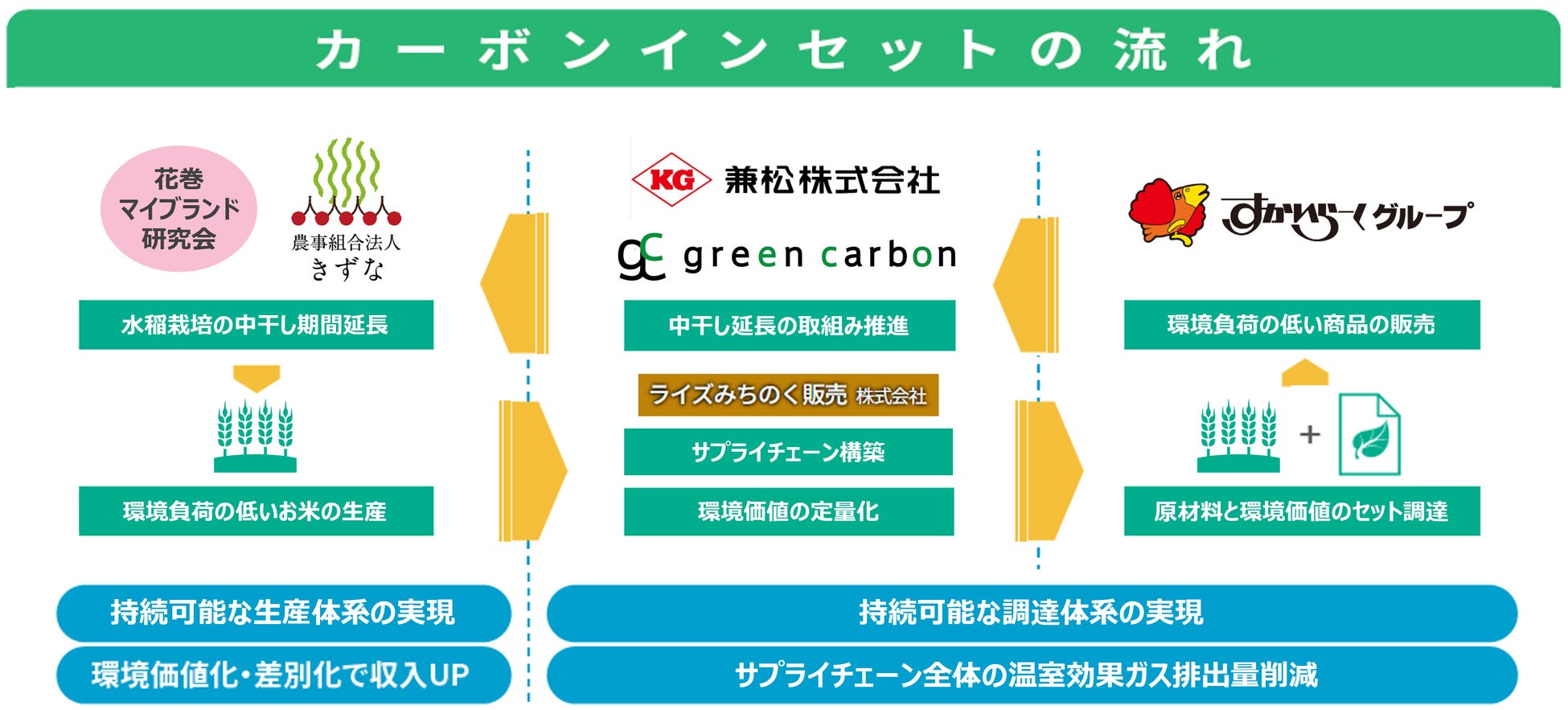 ネイチャーベースのカーボンクレジット創出・販売事業を展開するGreen Carbon株式会社(代表取締役:大北潤、以下Green Carbon(グリーンカーボン))は、株式会社すかいらーくホールディングス(代表取締役社長 COO:金谷 実、以下「すかいらーくグループ」)に対して、兼松株式会社(代表取締役社長:宮部 佳也)、ライズみちのく販売株式会社(代表取締役社長:奥本 浩之)、花巻マイブランド研究会および農事組合法人きずな(以下、生産者)と連携し、岩手県花巻市の圃場において、カーボンインセット(※1)の概念に基づき、生産者の圃場にて生産された国産米と環境価値のセット供給(以下「本取組み」)を実現したことを報告します。