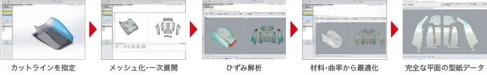 自由曲面を持つ複雑な3D形状から『正確な平面』に展開し、型紙データを容易に作成することができるシステムです。複合的な自由曲面を持つような複雑な形状であっても、布や紙などシート状の素材に対し、正確に短時間で平面展開することが可能です。