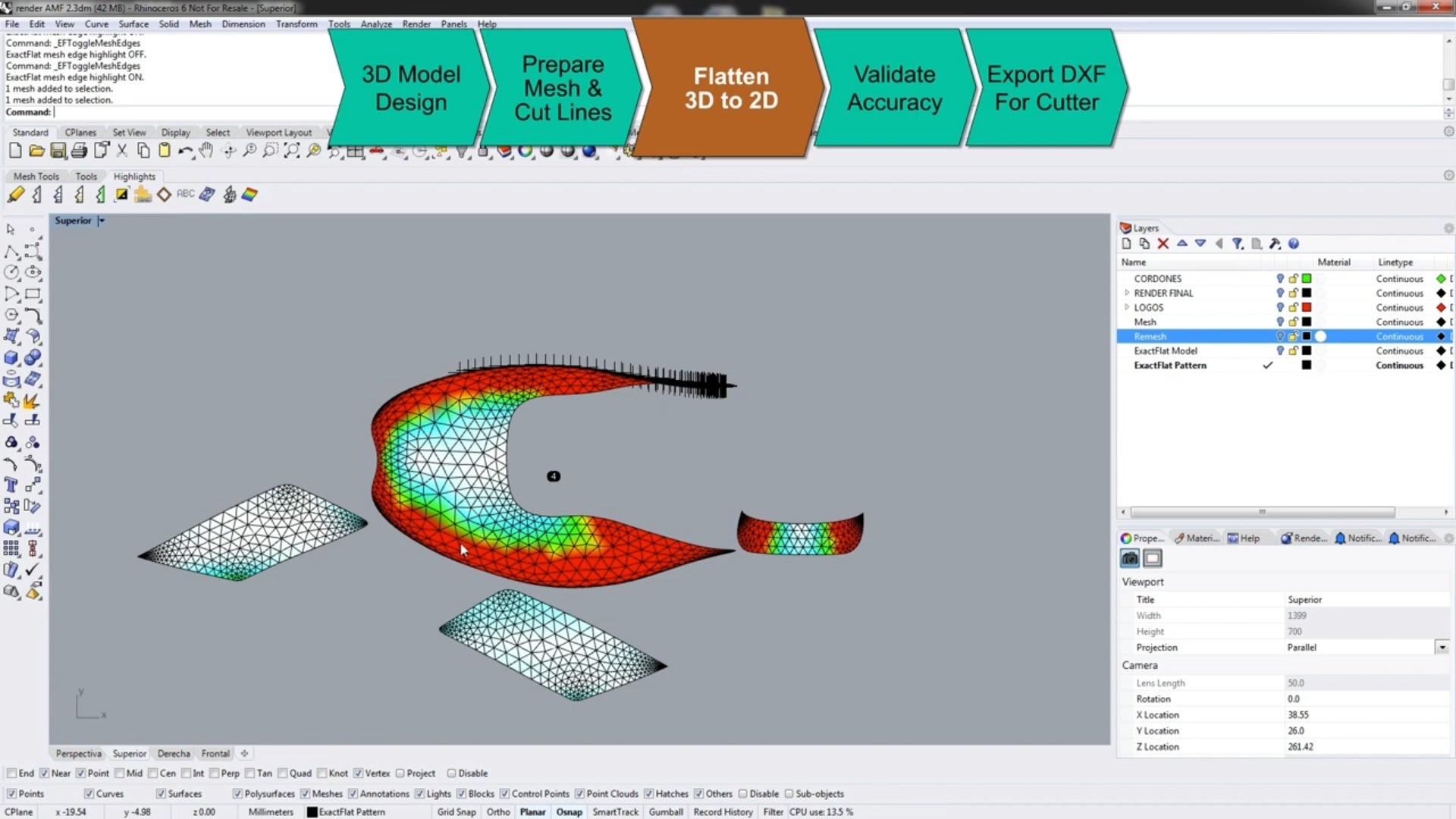 またExactFlat は、あらゆるタイプの素材で機能します。素材の特性を考慮した唯一の3Dから2Dへのフラット化ソフトウェアです。3Dから2D変換には、従来の織物、テクニカルテキスタイル、不織布、金属、複合材で機能します。