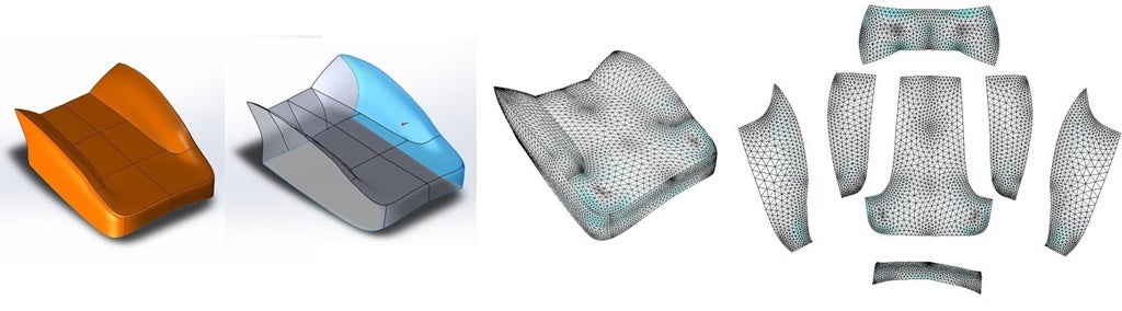 ExactFlat は、あらゆるタイプの表面形状で機能します。平面、曲面、さらには複雑な表面を持つ 3D CADモデルを正確に平坦化します。例えば、自動車のシート、アパレル、船舶用キャンバス、家具、塗装保護フィルムなどによく見られる複雑な曲面は、ExactFlat により簡単に平坦化されます。これは、しわや折り目を取り除き、ユーザーがターゲットの歪みを調整できる、2段階の3Dから2Dへの平坦化機能があるからです。