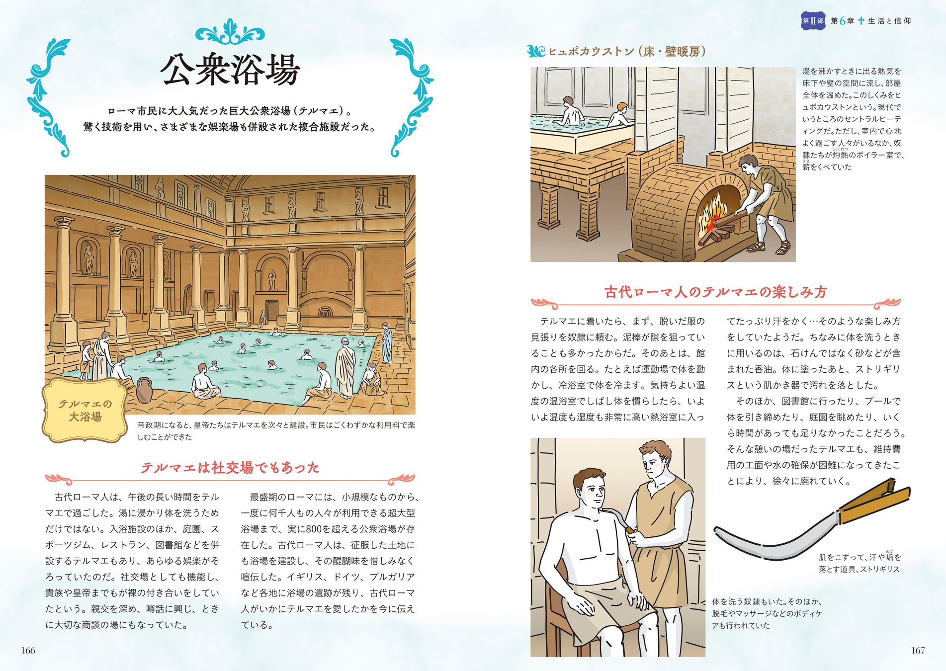 また、身分制度、住環境や食卓事情、テルマエ(公衆浴場)をはじめとする多彩な娯楽、ローマの人々の信仰など、市民たちの等身大の暮らしぶりも紹介。古代の人々の知恵と工夫を感じられます。