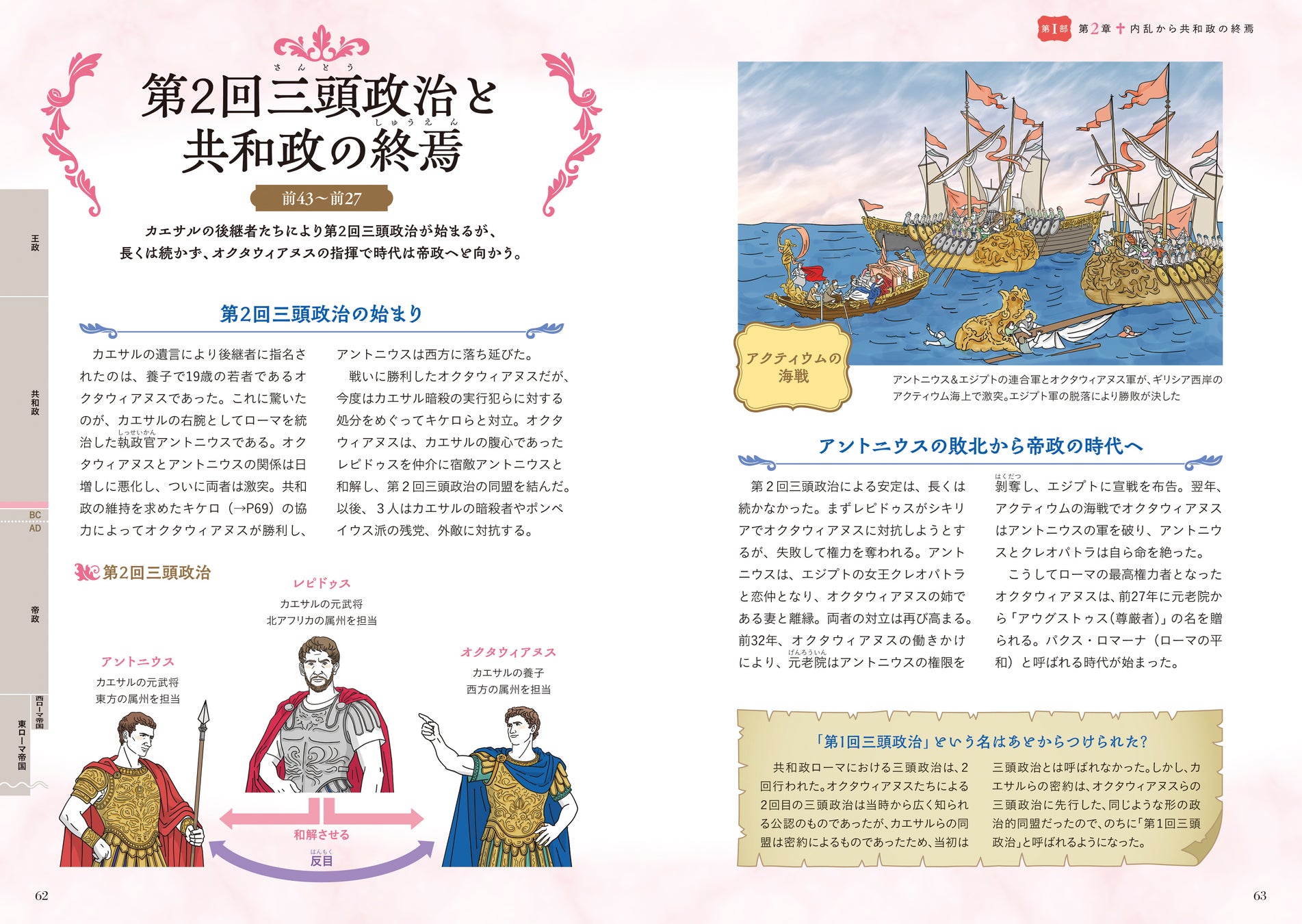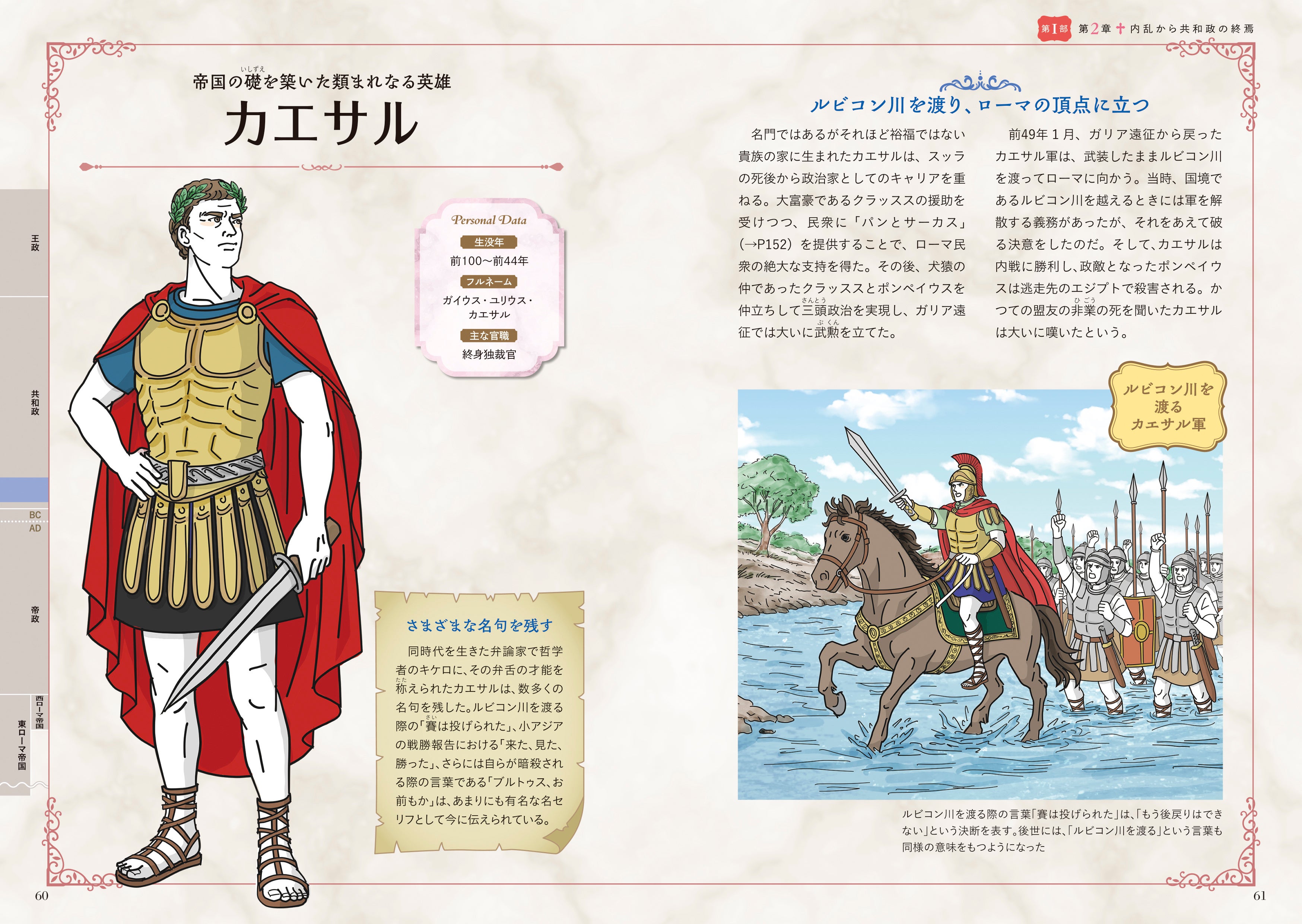 数々の戦争による支配拡大、カエサルの遠征や暗殺、アウグストゥスによる巧みな帝政の基盤づくり、のちの世界三大宗教となるキリスト教の公認(ミラノ勅令)など、歴史の転換点はイラストも豊富に添えて、親しみやすく解説しました。
