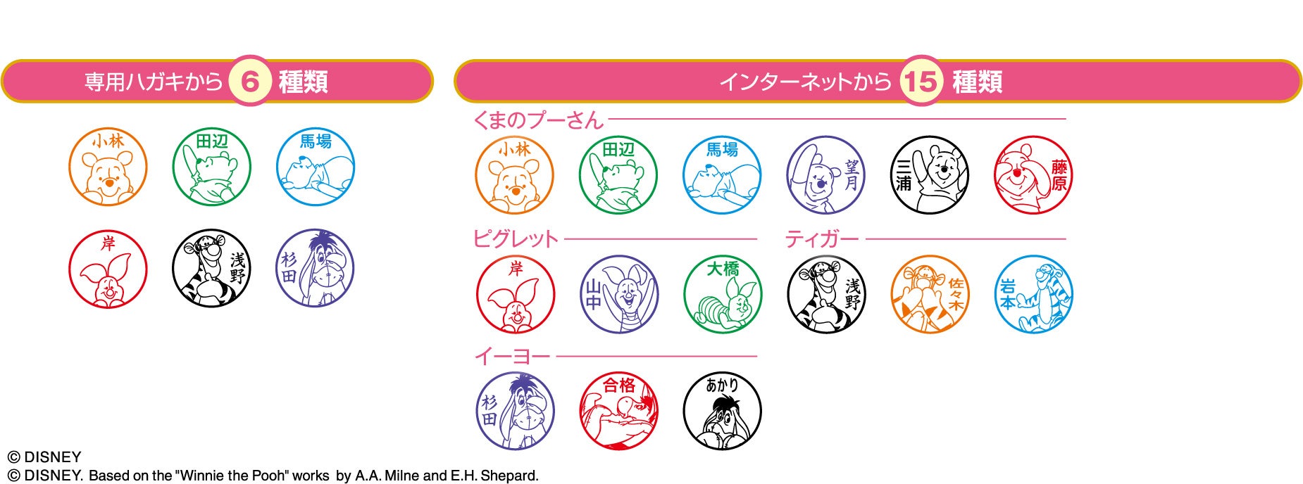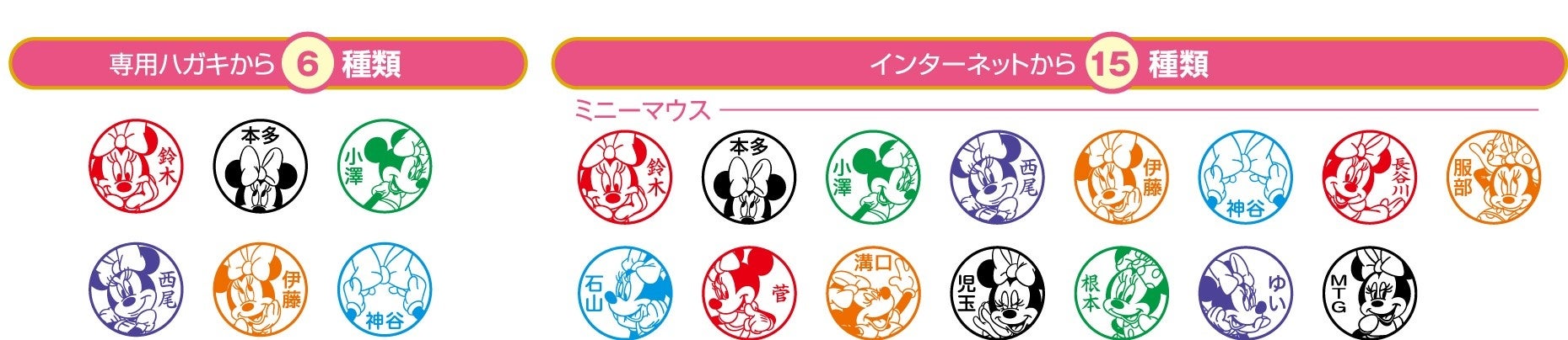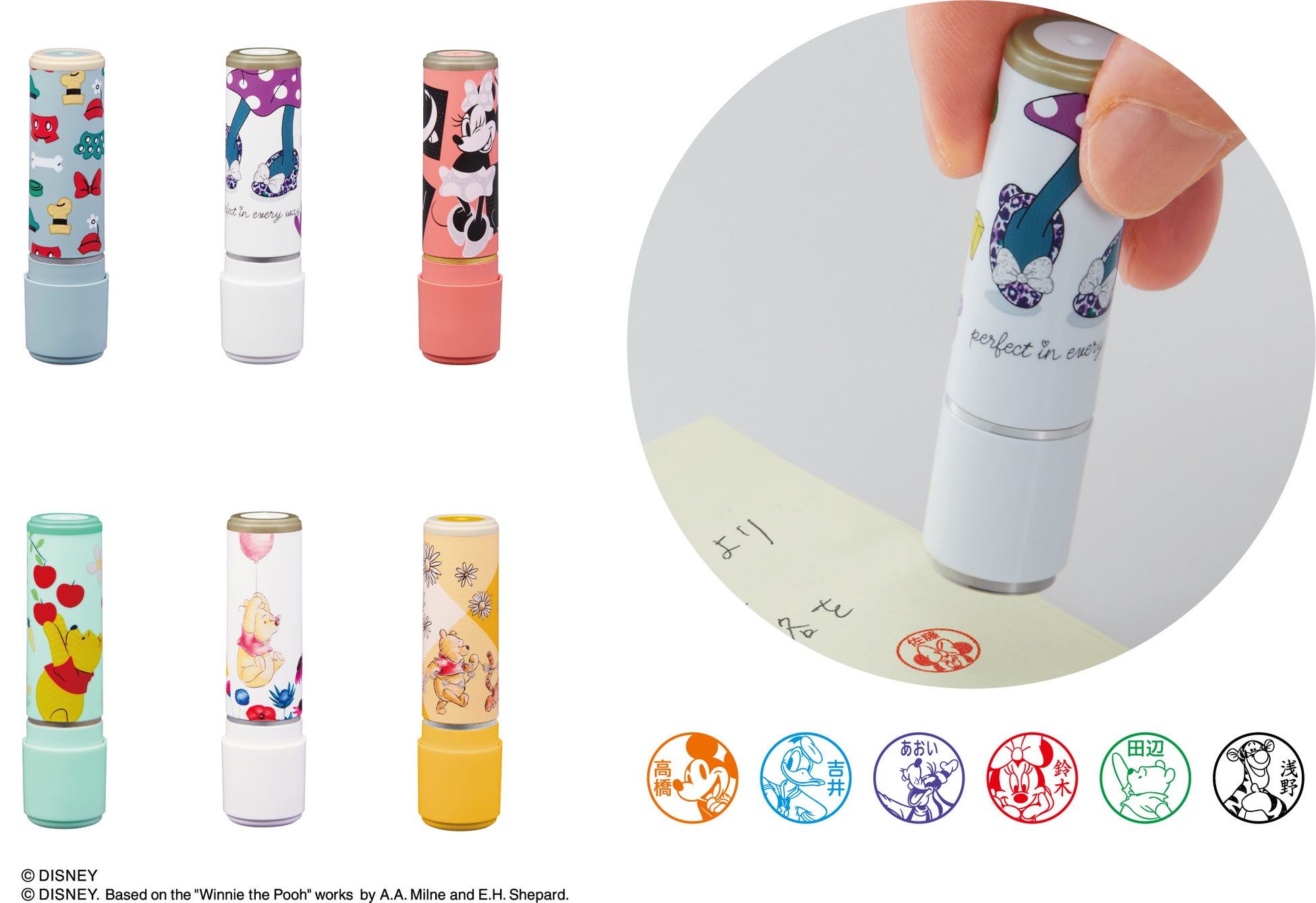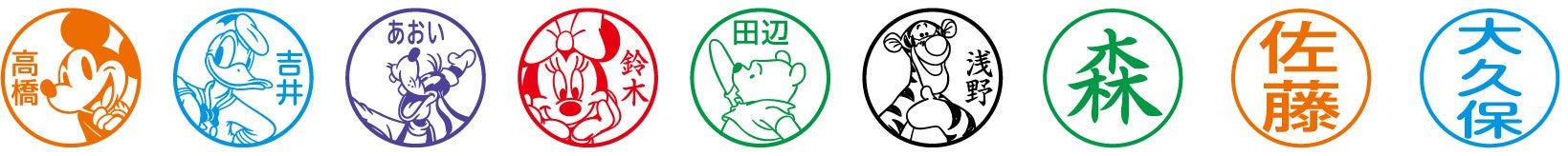 ディズニーキャラクター シリーズ「ネーム9メールオーダー式」は、ボディーにディズニーキャラクターアートをあしらったインキ内蔵式のネーム印です。ボディーのデザインは、ミッキー&フレンズ(1種)、ミニーマウス(2種)、くまのプーさん(3種)の全6種類をご用意しました。また、印面はディズニーキャラクターのイラストと名前を組み合わせてオリジナルのネーム印を作ることができます。ミッキー、ミニー、ドナルドダック、プーさんなどの人気キャラクターをはじめとした豊富なイラストをご用意しました。
