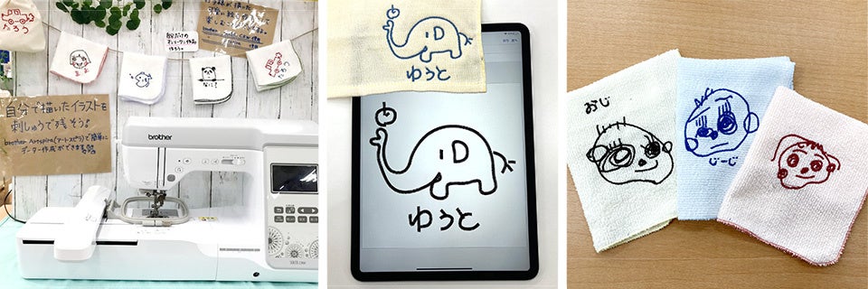刺しゅうミシン投入店舗において、タオルハンカチ刺しゅうイベントを実施中。iPadに描いた絵や文字がそのままミシン刺しゅうとして仕上がりますので、オンリーワンの作品が作れます。