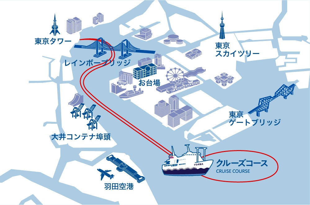19:15竹芝客船ターミナル出航 ~ 東京湾内周遊 ~ 21:00竹芝客船ターミナル帰着