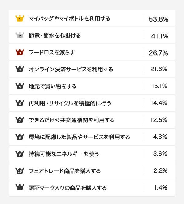 4位以下は「オンライン決済サービスを利用する(21.6%)」「地元で買い物をする(15.1%)」「再利用・リサイクルを積極的に行なう(14.4%)」「できるだけ公共交通機関を利用する(12.5%)」「環境に配慮した製品やサービスを利用する(4.3%)」「持続可能なエネルギーを使う(3.6%)」「フェアトレード商品を購入する(2.2%)」「認証マーク入りの商品を購入する(1.4%)」と続いています。