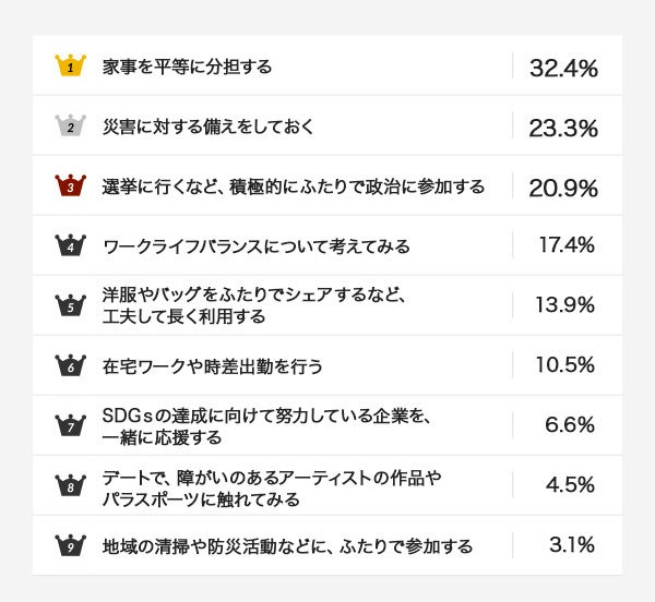 4位以下は「ワークライフバランスについて考えてみる(17.4%)」「洋服やバッグをふたりでシェアするなど、工夫して長く利用する(13.9%)」「在宅ワークや時差出勤を行なう(10.5%)」「SDGsの達成に向けて努力している企業を、一緒に応援する(6.6%)」「デートで、障がいのあるアーティストの作品やパラスポーツに触れてみる(4.5%)」「地域の清掃や防災活動などに、ふたりで参加する(3.1%)」「その他(0.3%)」と続きました。