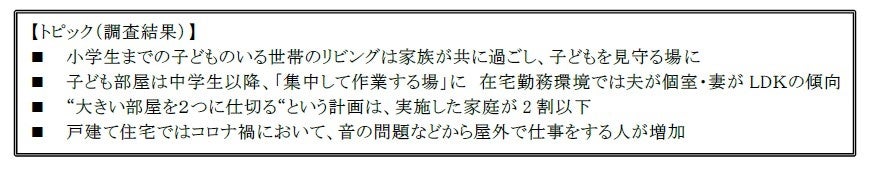 子ども部屋の利用形態として、各世帯の子ども一人ひとりについて聞いたところ、小学生(4-6年生)までは、「就寝する、昼寝する」の割合が低く、「おもちゃやゲーム等で遊ぶ」割合が高い。中高生以降は「仕事・勉強をする」、「スマートフォン等の操作」、「授業を受ける・会議に参加する」など集中して行う作業などで使用される。また、在宅勤務を行う場所は、夫は個室、妻はダイニングテーブル(LDK)という傾向が明らかになった。