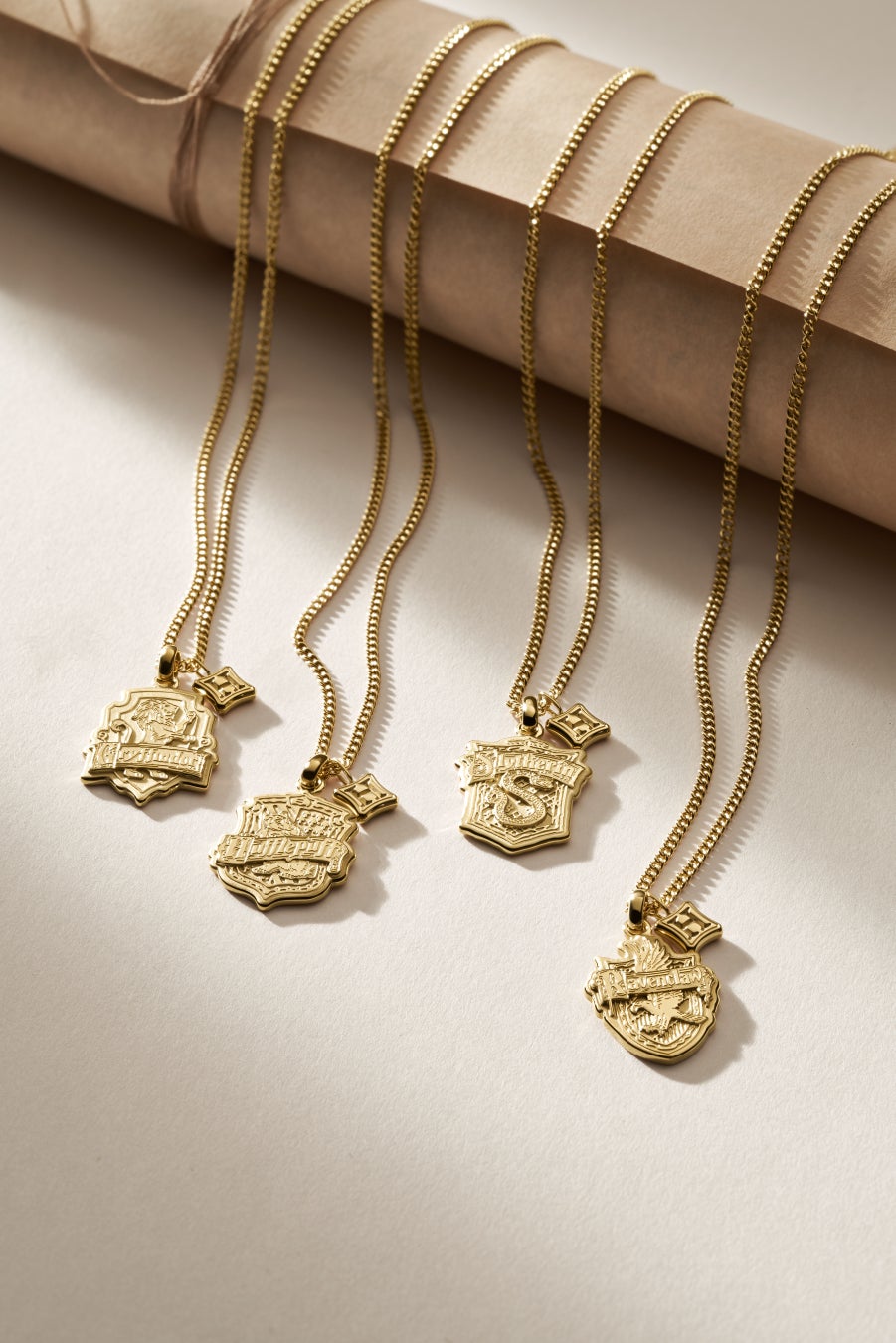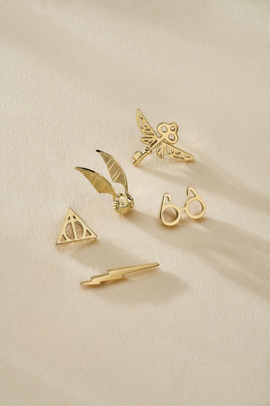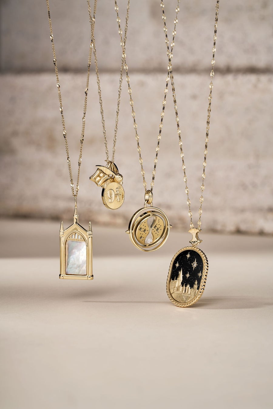 また、ハリー・ポッターの冒険へのオマージュとして、魔法ワールドの象徴的なシンボルからインスピレーションを得たネックレスとスタッズピアスのセットもラインアップ。ネックレスは、タイムターナーや、エリセードの鏡、ホグワーツ城、金のスニッチと9と4分の3番線のチャームがついたもの計4型、そしてピアスセットには稲妻、ハリーのメガネ、空飛ぶ鍵、金のスニッチ、死の秘宝のモチーフがセットになっています。