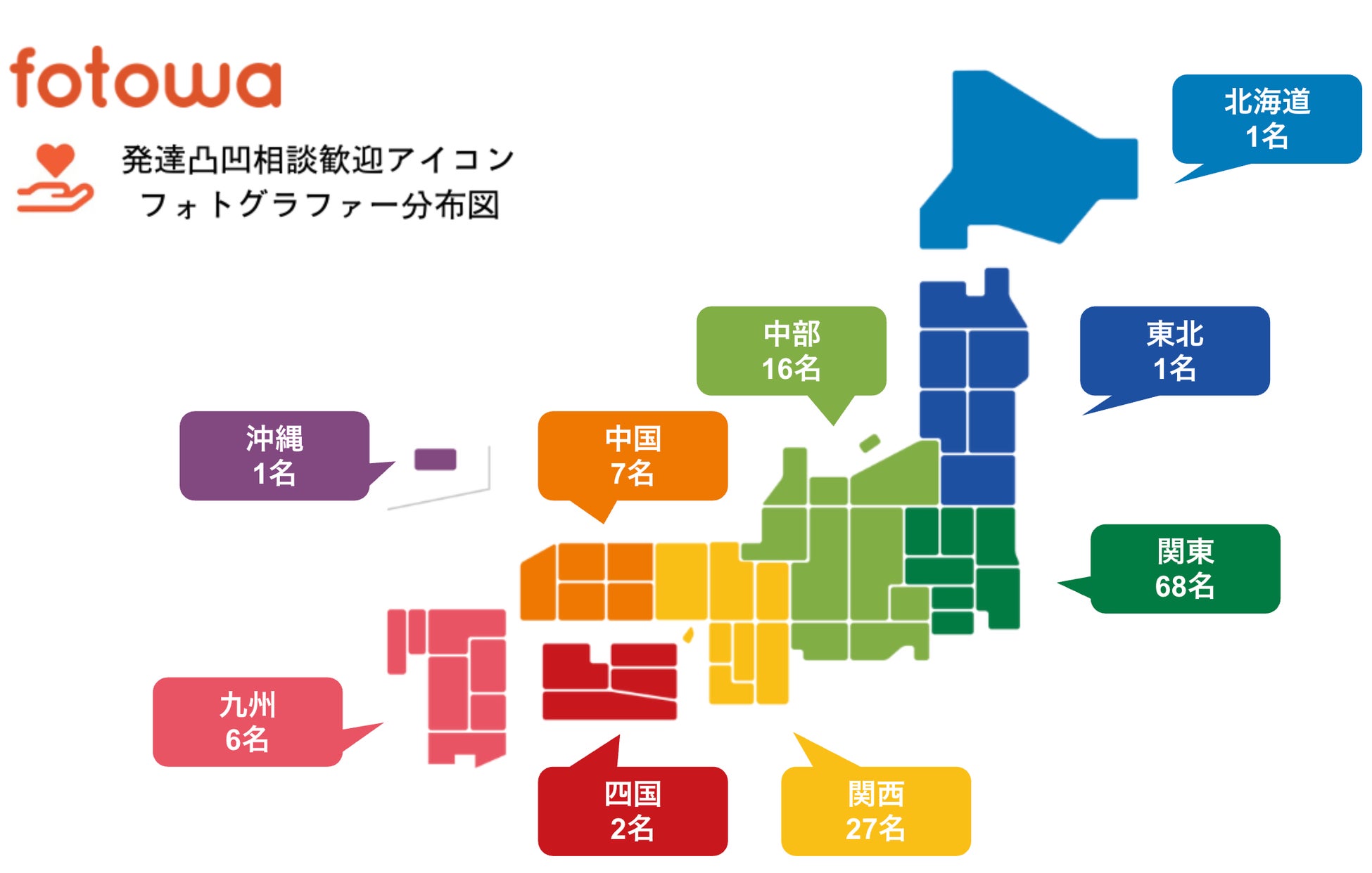 「発達凸凹相談歓迎」アイコンの表示を開始した今年3月は、54名のフォトグラファーがアイコンを取得しました。現在、アイコンを取得したフォトグラファーは129名に増加。取り組み開始から約半年で、約2倍のフォトグラファーが発達特性があるお子さま・ご家族の撮影をサポートする意思を表明するまでに拡大しています。地域別にみると、東京・神奈川・大阪など大都市を中心に28都道府県に分布し各地方を網羅しました。
