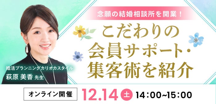 【12月14日開催】結婚相談所開業・副業を検討の方向けオンラインセミナー!【念願の結婚相談所を開業!こだわりの会員サポート・集客術を紹介】
