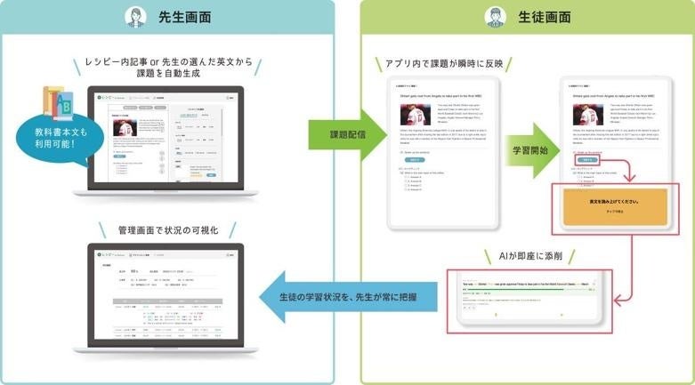 こうした蓄積に、当社が展開してきたAIを活用して、実践的な英語が学べる英語学習プラットフォーム「レシピー」が加わることで、生徒にとってはより実践的で効率的な、学校の教員にとっては負担軽減につながる、新たな英語学習サービスを提供することが可能となります。今後、両社で新たな英語学習環境の提供を検討し、実施していく考えです。