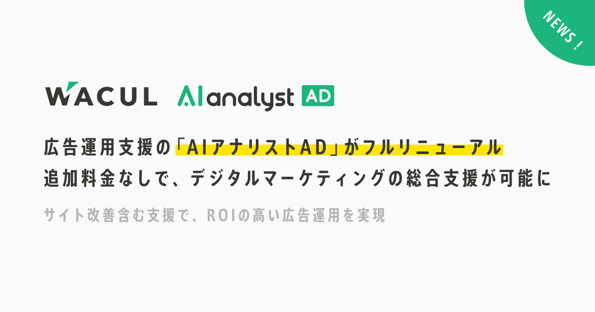 データ分析ツール「AI アナリスト」でマーケティングDX を自動化する株式会社WACUL(読み:ワカル、本社:東京都千代田区、代表取締役CEO:大淵 亮平、証券コード:4173、以下WACUL)は、この度、広告運用支援サービスの「AIアナリストAD」をリニューアルしたことをお知らせします。