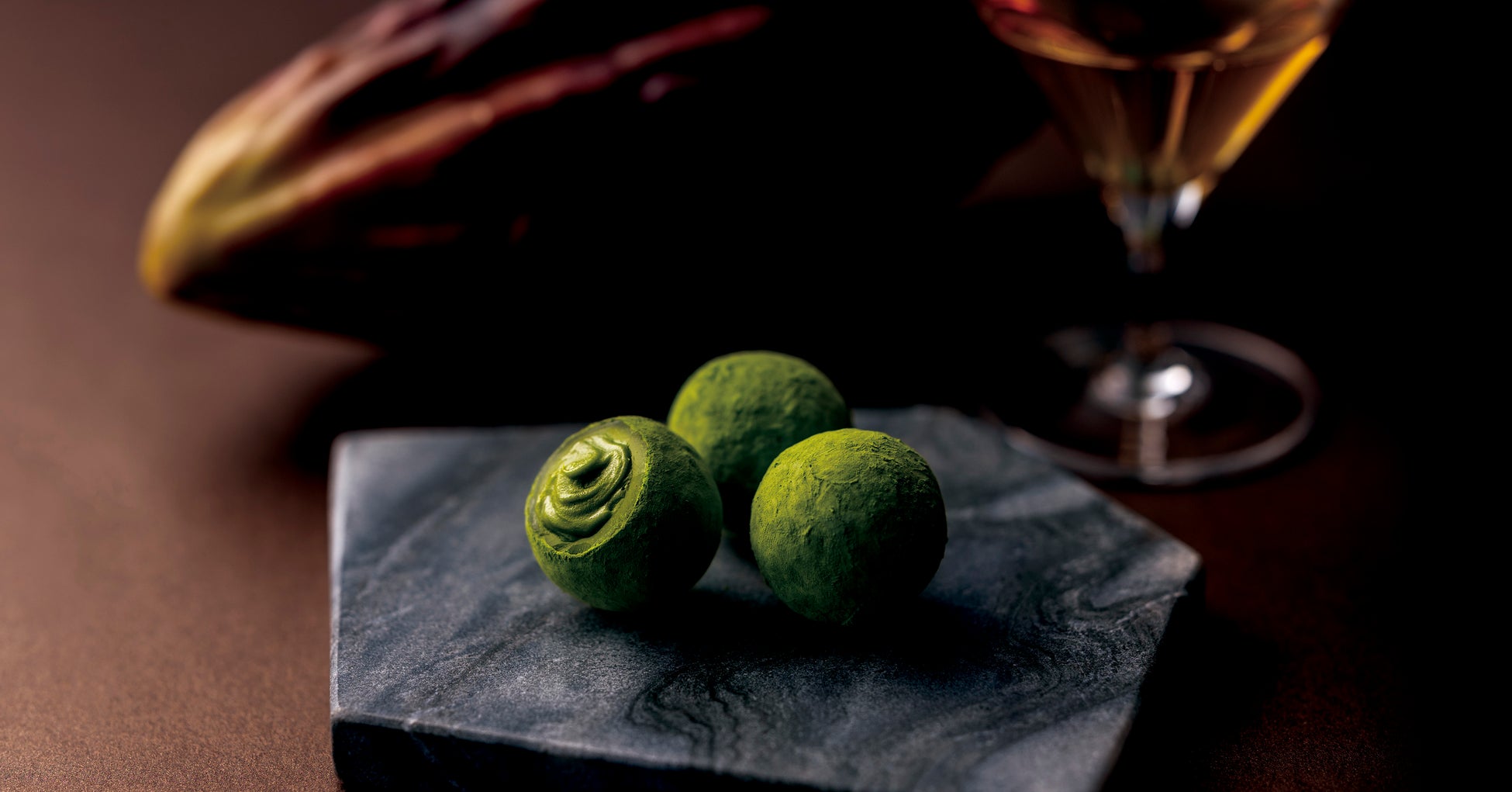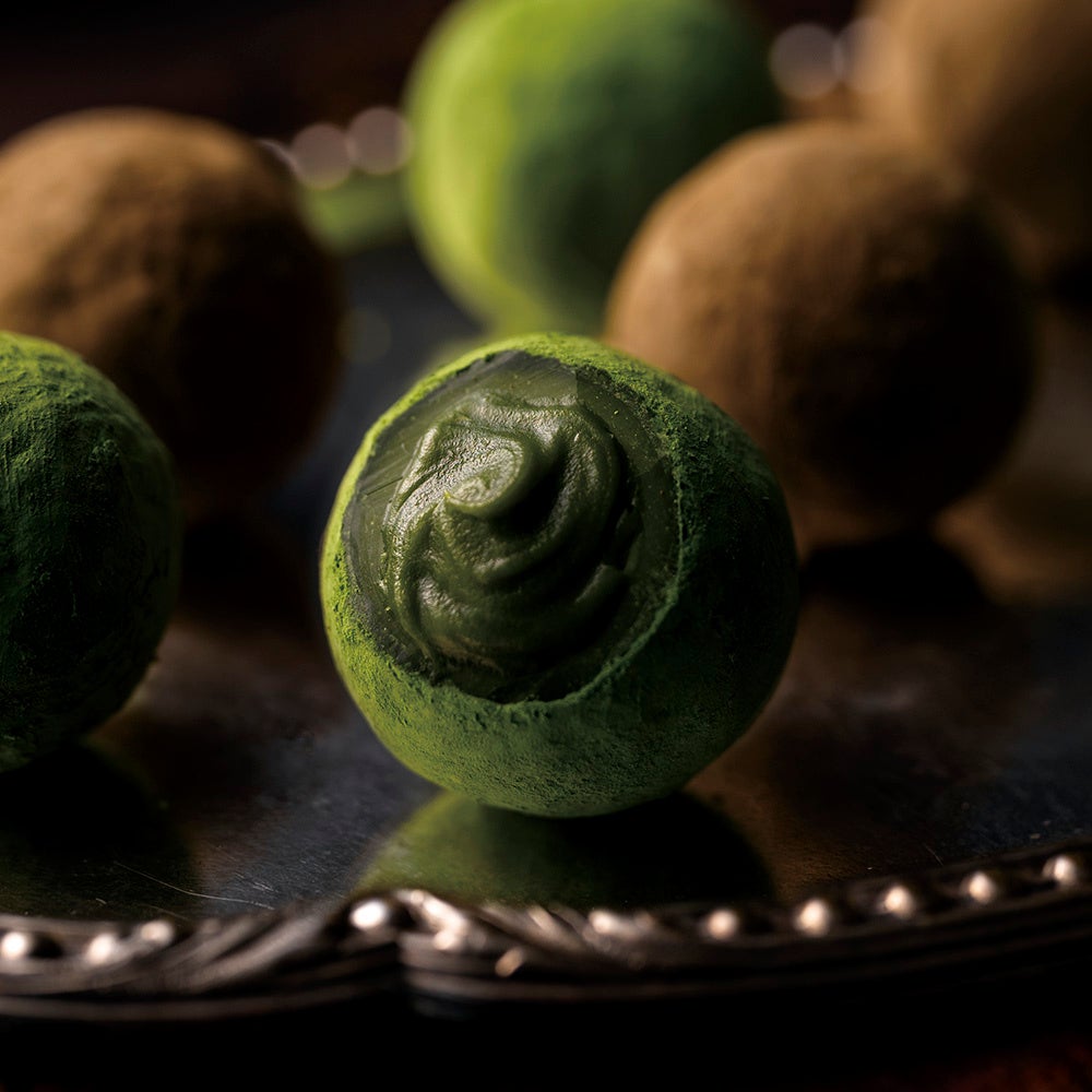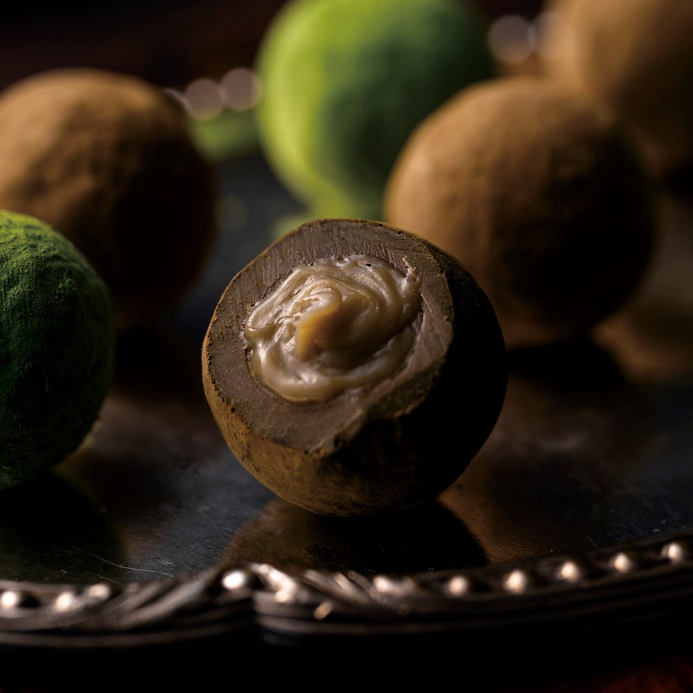晩酌でゆっくりと時間をかけて嗜むお酒のように、宇治茶の味わいを心ゆくまで感じていただきたい。抹茶にラム酒を、ほうじ茶にブランデーを合わせることも、様々な洋酒との組み合わせや配合を幾度となく試行錯誤しました。ボンボンショコラのように中に洋酒が入っているとお酒の香りが立ちすぎることから、ガナッシュに練り込むことで宇治茶を引き立てるショコラに仕上がり、この新ショコラの開発に成功したのです。