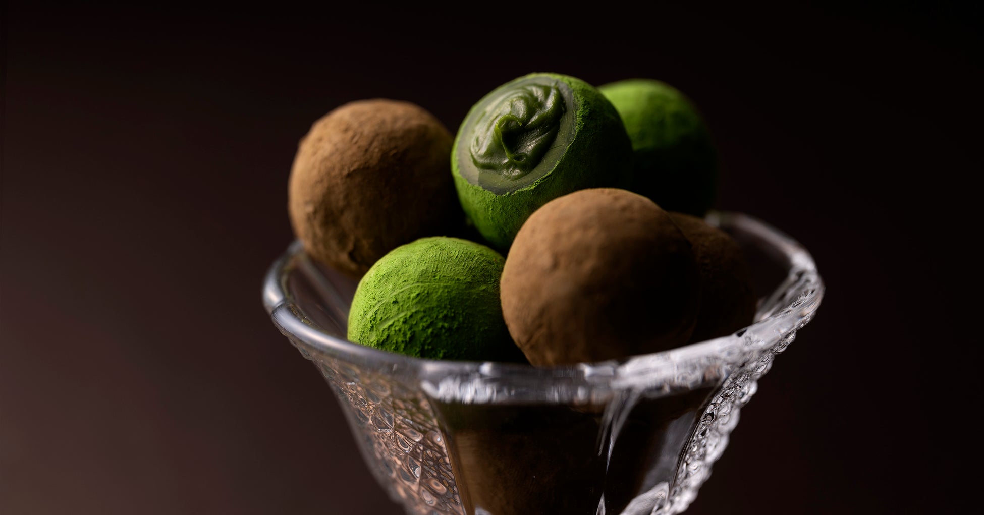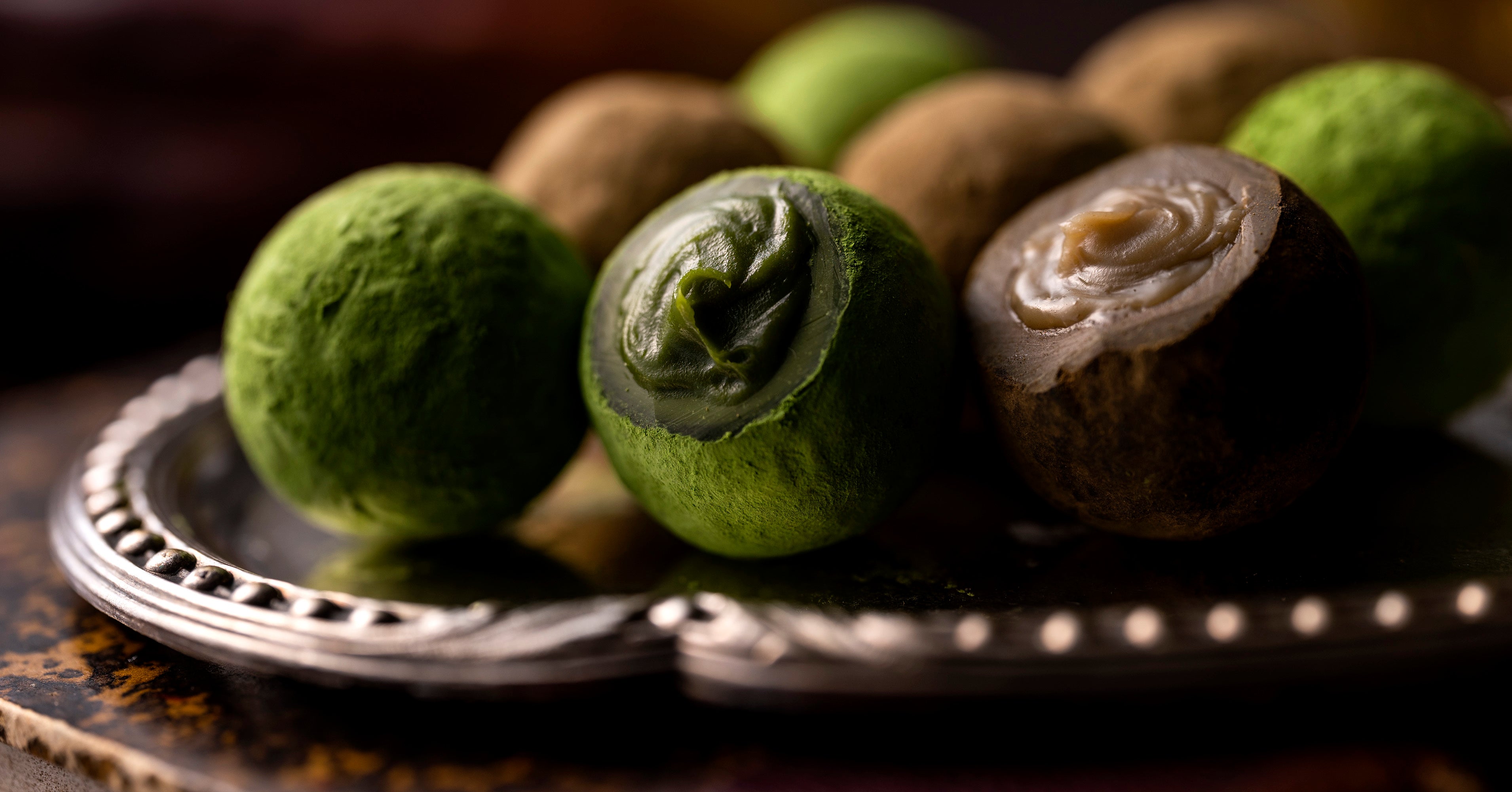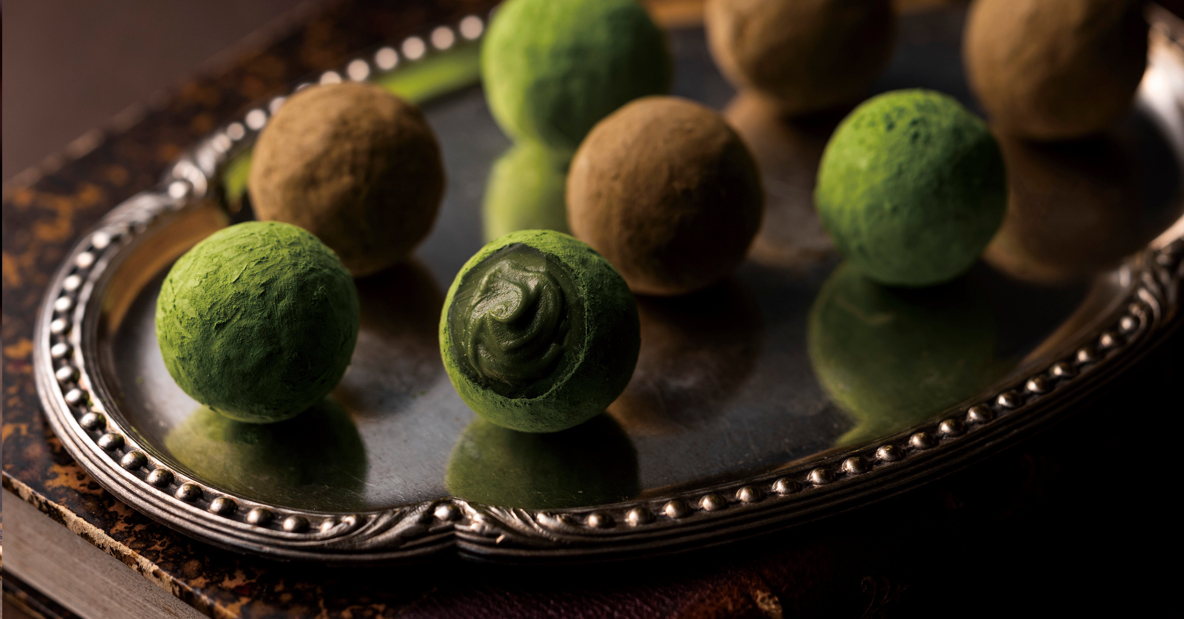 晩酌でゆっくりと時間をかけて嗜むお酒のように、宇治茶の味わいを心ゆくまで感じていただきたい。抹茶にラム酒を、ほうじ茶にブランデーを合わせることも、様々な洋酒との組み合わせや配合を幾度となく試行錯誤しました。ボンボンショコラのように中に洋酒が入っているとお酒の香りが立ちすぎることから、ガナッシュに練り込むことで宇治茶を引き立てるショコラに仕上がり、この新ショコラの開発に成功したのです。
