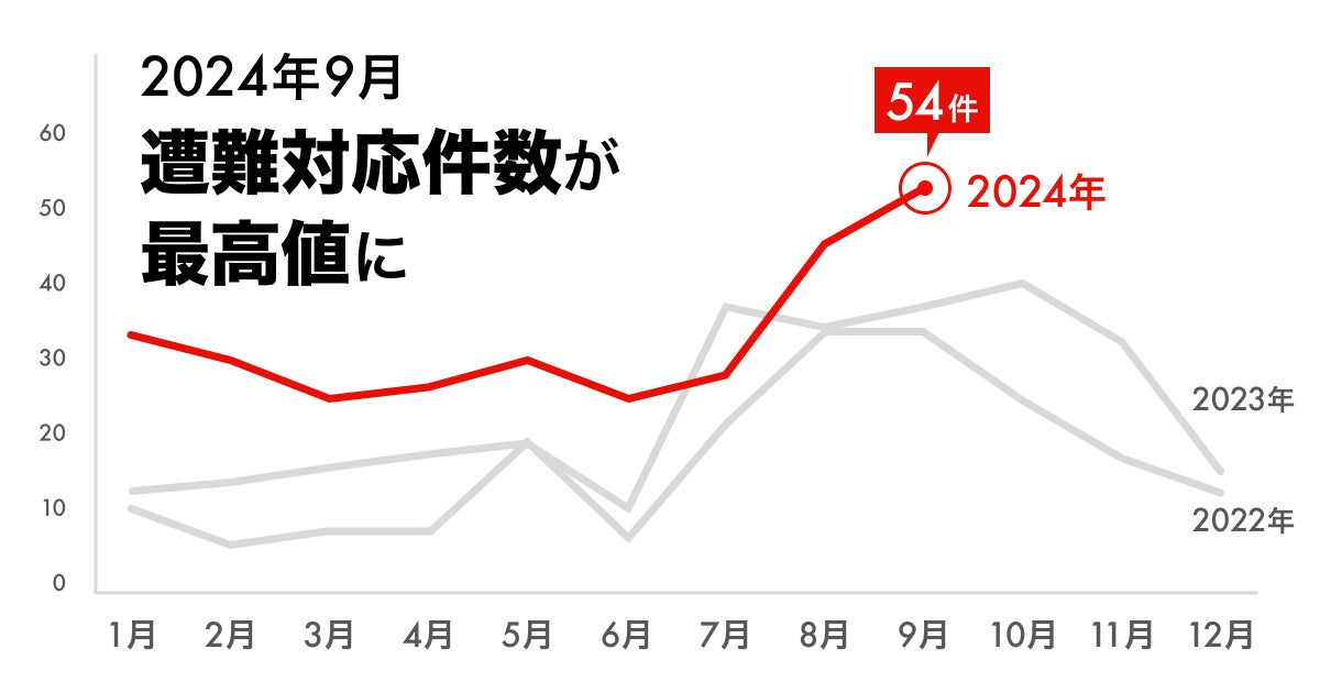 警察及び救助機関からの情報照会依頼への累計対応件数は916件、2024年9月単月で過去最多の54件にのぼり、引き続き山岳遭難のお問合せが増加しています。