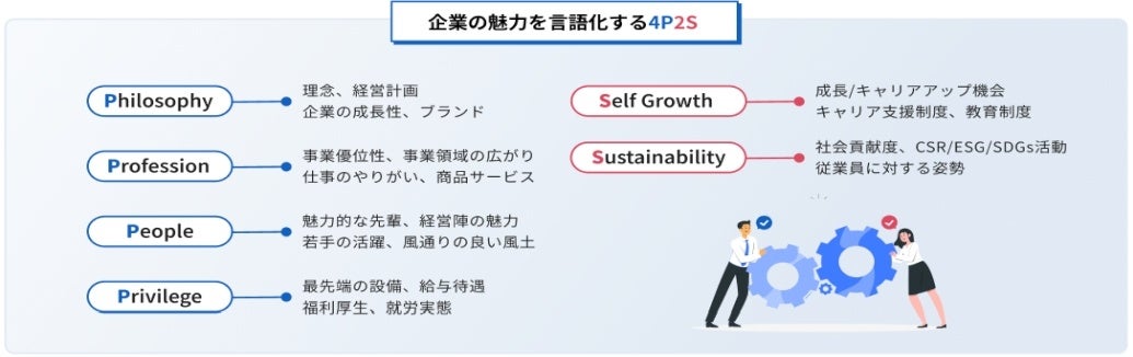 さらに若年層の求職者を中心に「Self Growth」「Sustainability」の観点を加えた4P2S(Philosophy、Profession、People、Privilege、Self Growth、Sustainability)のオリジナルフレームワークで企業の魅力を整理し、ターゲットとなる求職者の「共感」と「納得」を生み出す採用ブランディングを設計します。