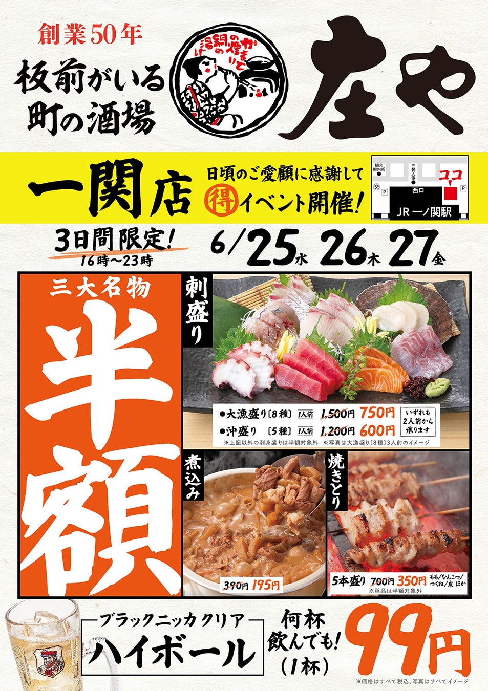 【一関駅西口『庄や』で半額セール!!】6/25(水)から6/27(金)の3日間限定で直送鮮魚の刺身盛りに焼き鳥、もつ煮込みも超特価