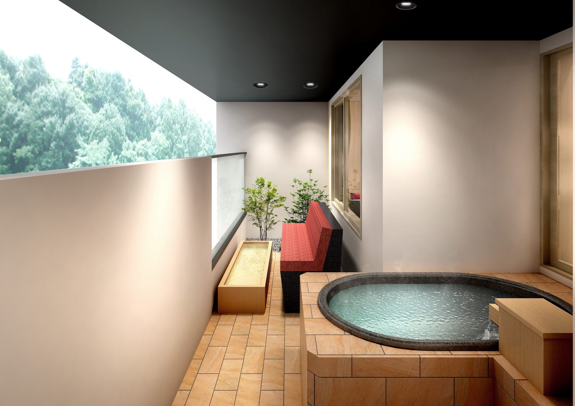 全室に源泉かけ流しの露天風呂を備え、一の湯では初めての「足湯」とサンベッドを併設。窓が多く、自然光がたっぷりと入る設計です |