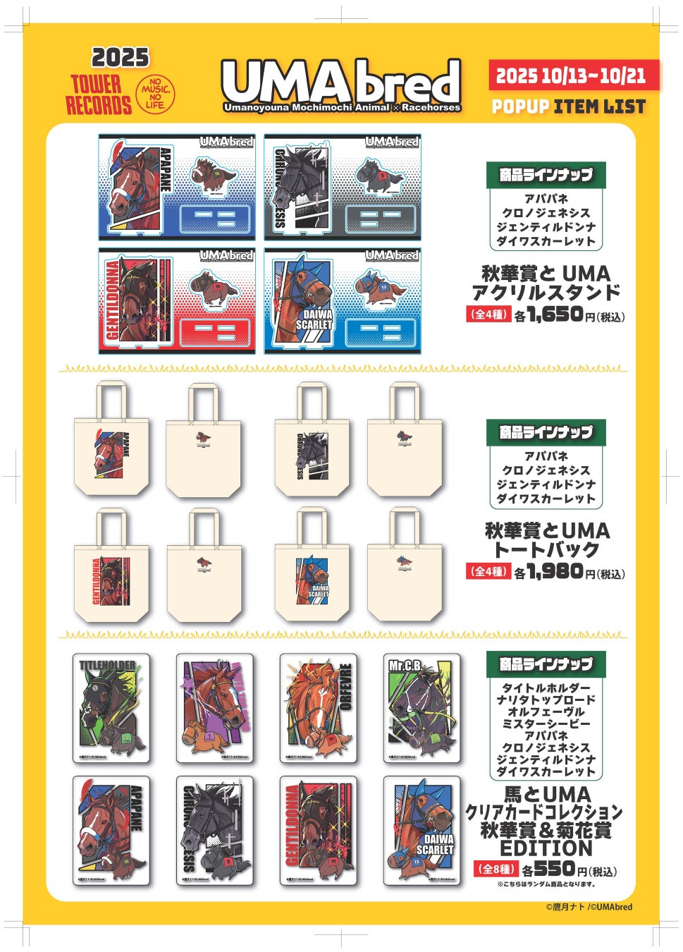 実在の競走馬・引退馬を「UMA」(ウマのようなモチモチアニマル)として描きおろすグッズブランド「UMAbred」は10/13(月・祝)よりタワーレコード渋谷店にて完全新規ラインナップグッズのPOPUPを開催いたします。