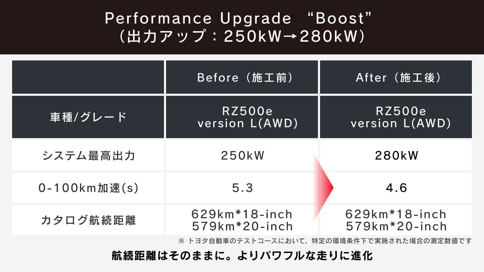 BEV ECUのソフトウェアを最適化することで、システム最高出力を250kWから280kWへと向上させます。これにより0-100km/hの加速性能が5.3秒から4.6秒*³に高まるだけでなく、中間加速領域においても、より伸びやかで爽快なドライビングフィールを実現。航続距離はそのままに、RZが持つ本来の運動性能をさらに引き出します。