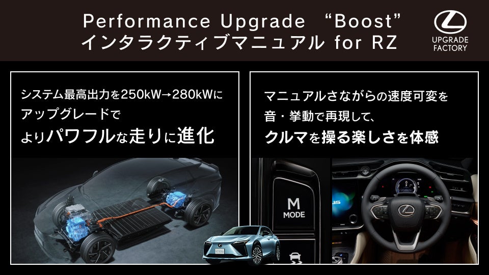 トヨタ・レクサス・GRの純正オプションを、正規販売店で「後付け」ができるサービス「LEXUS UPGRADE FACTORY」*¹において、LEXUS RZならではの走りの楽しさをアップグレードする「Performance Upgrade "Boost" + インタラクティブマニュアルドライブ for RZ」のご提供を、本日より開始しました。