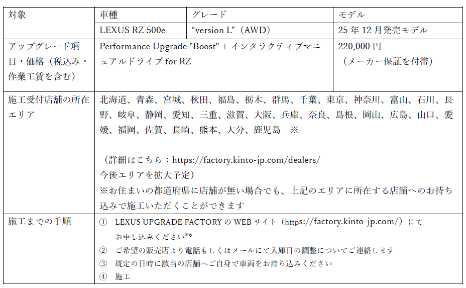 対象は、本日発売したLEXUS RZ 500e “version L”(AWD)で、システム最高出力を250kW→280kWにアップグレードし、よりパワフルな走りに進化させる「Performance Upgrade "Boost"」と、マニュアルさながらの速度可変を音・挙動で再現し、BEVでクルマを操る楽しさを体感できる「インタラクティブマニュアルドライブ」*²の2つのアップグレードをセットでご提供することで、加速性能とクルマを操る喜びをお届けします。