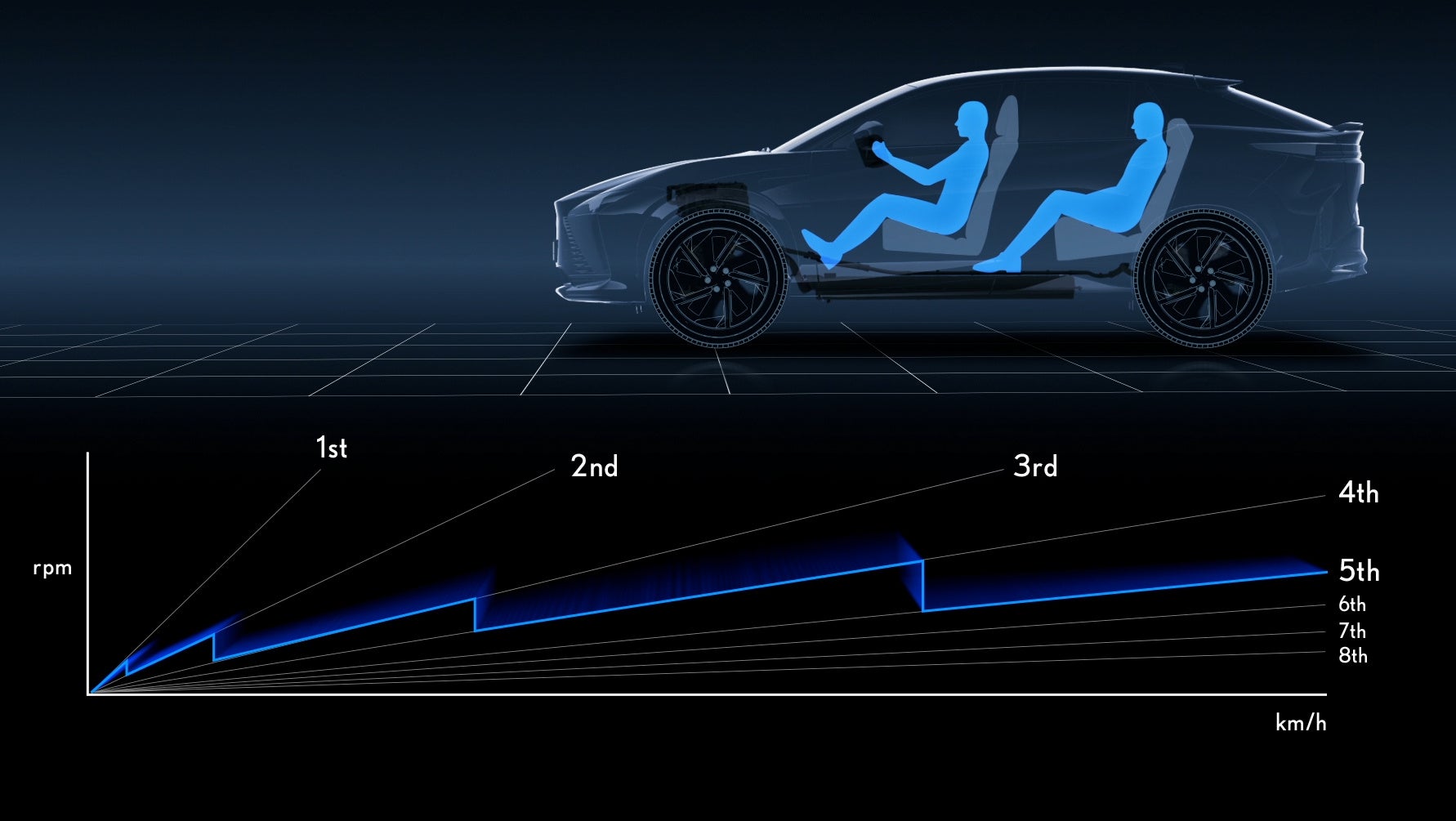 仮想パワーソースと8速の仮想トランスミッションを持ち、アクセル開度と車速に応じて算出した仮想パワーソーストルクにパドルシフトで選択したギヤ段のギヤ比を乗じて駆動力を出力。高揚感のある加速やシーンに応じた操作を通じてより深くクルマとの対話を楽しむことが可能になります。