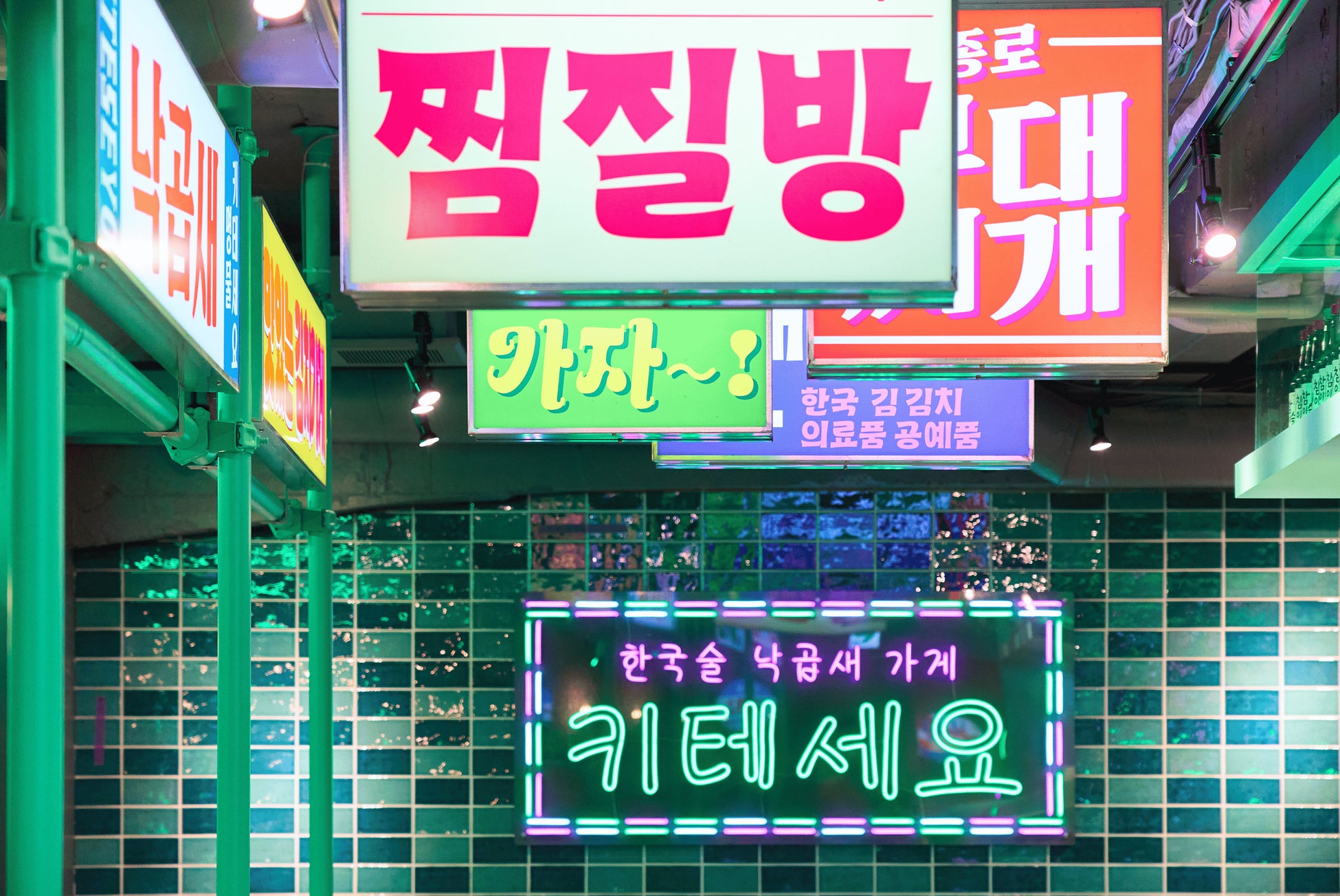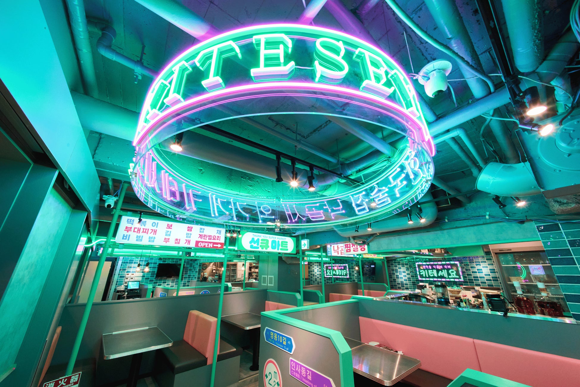 店内はどのお席からもトレードマークのネオンやハングル看板が見え、キテセヨならではの韓国カルチャー空間を楽しんでいただけます。
