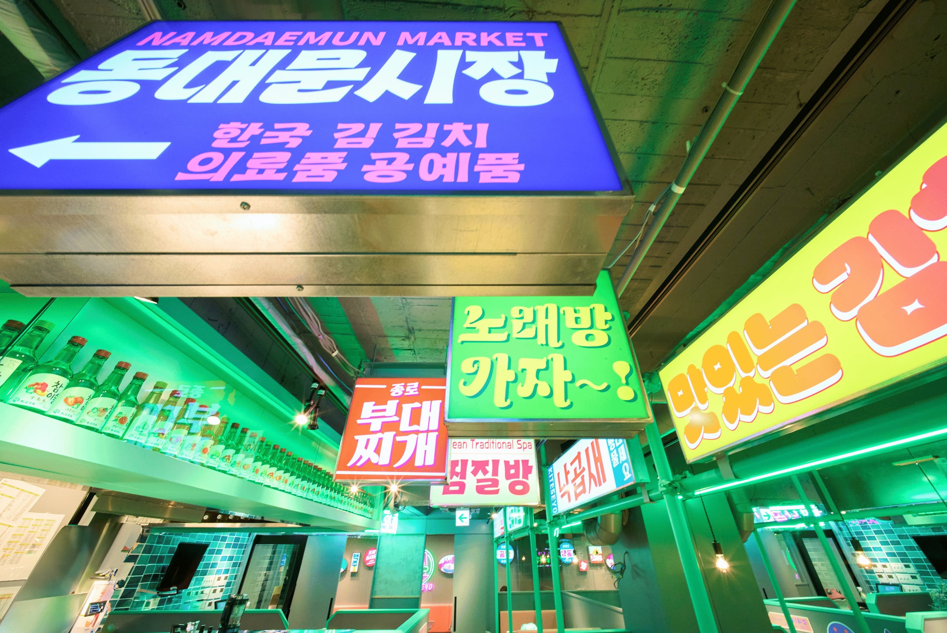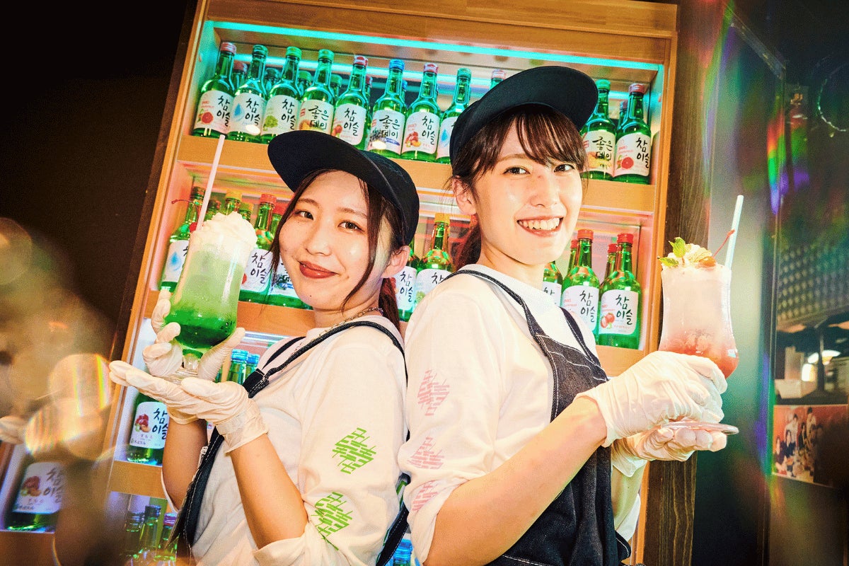 店内はキテセヨグリーンを基調とし、ネオンやハングル看板が映えるネオ酒場空間で統一、K-POP好きで人懐っこいスタッフ達があなたの楽しいひと時を盛り上げます。