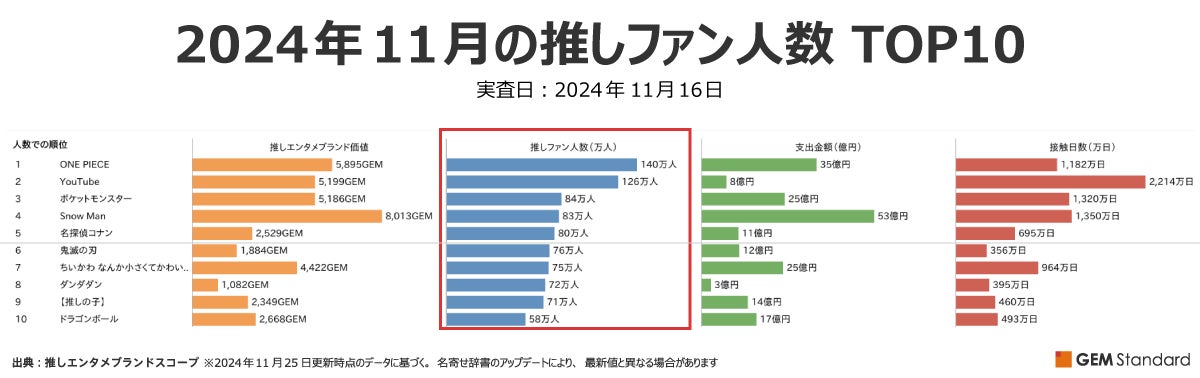 2024年11月の「推しファン人数TOP10」は上記となりました。1位には『ONE PIECE』がランクイン。前月の推しファン人数とほぼ同水準の140万人を維持し、4カ月連続で首位を獲得しました。そのほかのランキングにおいても、「支出金額」では3位、「接触日数」では4位と上位に入っており、「推しファン人数」「支出金額」「接触日数」から算出されるエンタメブランドの経済価値を示した指標「推しエンタメブランド価値」では3位となりました。