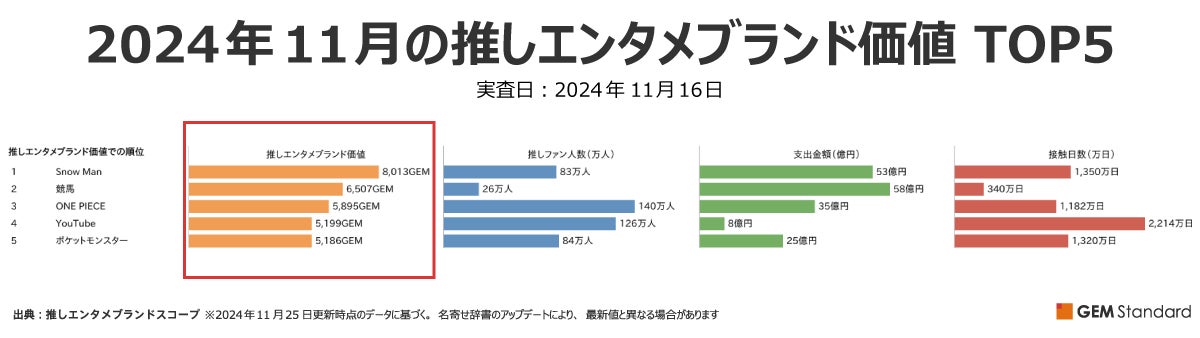 メディアを横断して、推しているファン(=推しファン)が多いエンタメブランドはなにか。エンタテイメント業界に向けたデータ×デジタルマーケティングサービスを提供するGEM Partners株式会社(ジェムパートナーズ、所在地:東京都港区、代表取締役:梅津文)では、エンタメビジネスの最大化をサポートする商品「推しエンタメブランドスコープ」で毎月調査を実施しており、最新のエンタメブランド価値の計測が可能です。今回、2024年11月調査結果のハイライトをお伝えします。