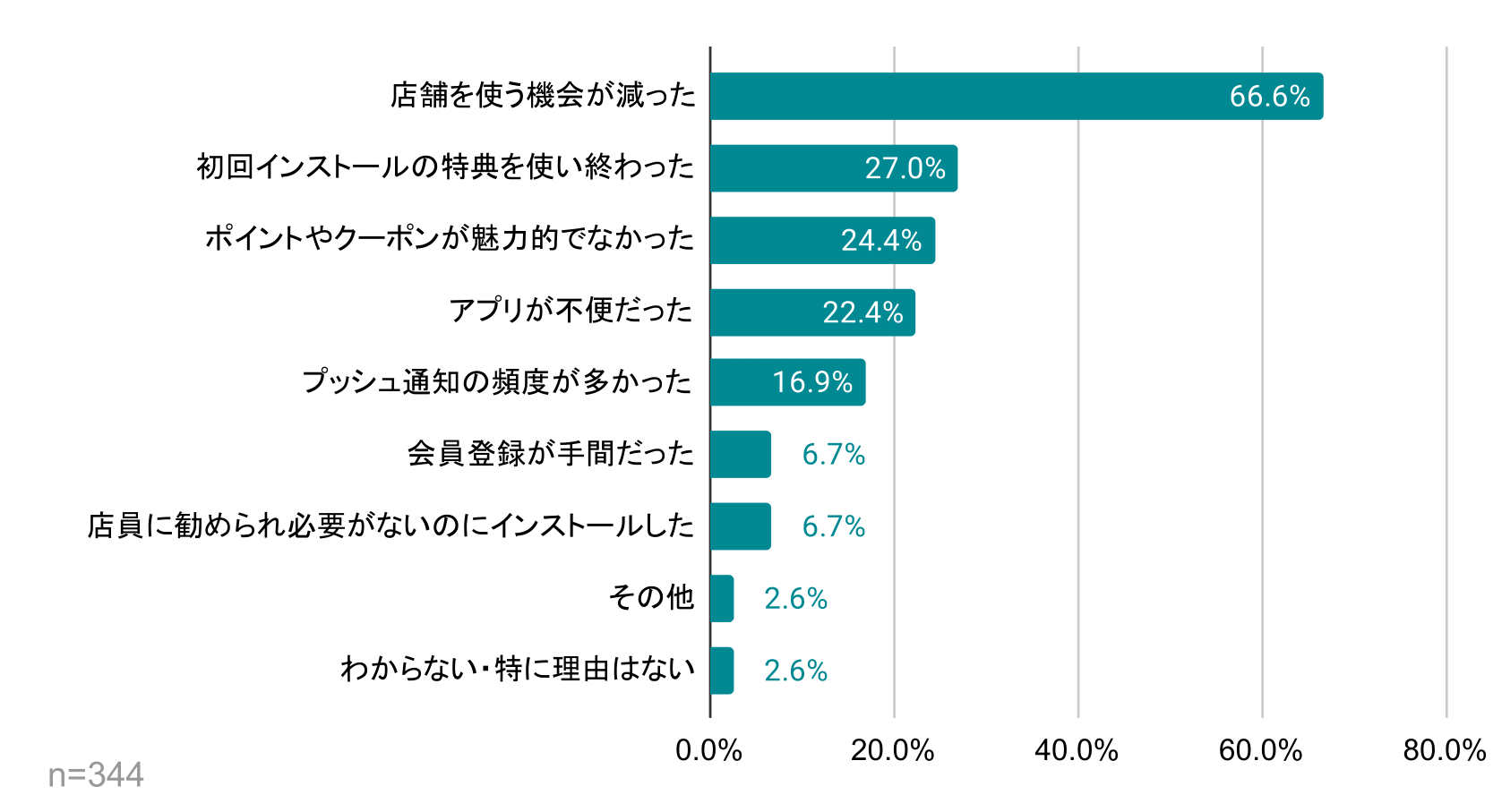 これまでアプリをアンインストールしたことがあるかを尋ねると、7割以上のユーザーが「ある」と回答しました。その理由を尋ねると、「店舗を使う機会が減った」が66.6%と最多でした。来店頻度はアプリのみで解決できる課題ではないものの、アプリで来店を促す施策を打つことは有効といえそうです。