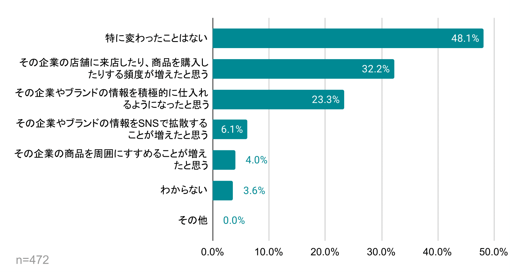 アプリをインストールする前後で行動の変化があったかどうかを尋ねると、「特に変わったことはない」という回答が48.1%ともっとも多い結果になりました。