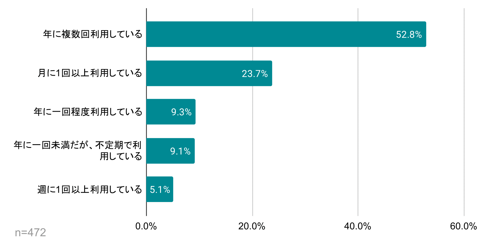 店舗アプリをインストールしたことがあると回答した人に、アプリの利用頻度を尋ねたところ、「年に複数回利用している」が52.8%と半数を占める結果になりました。