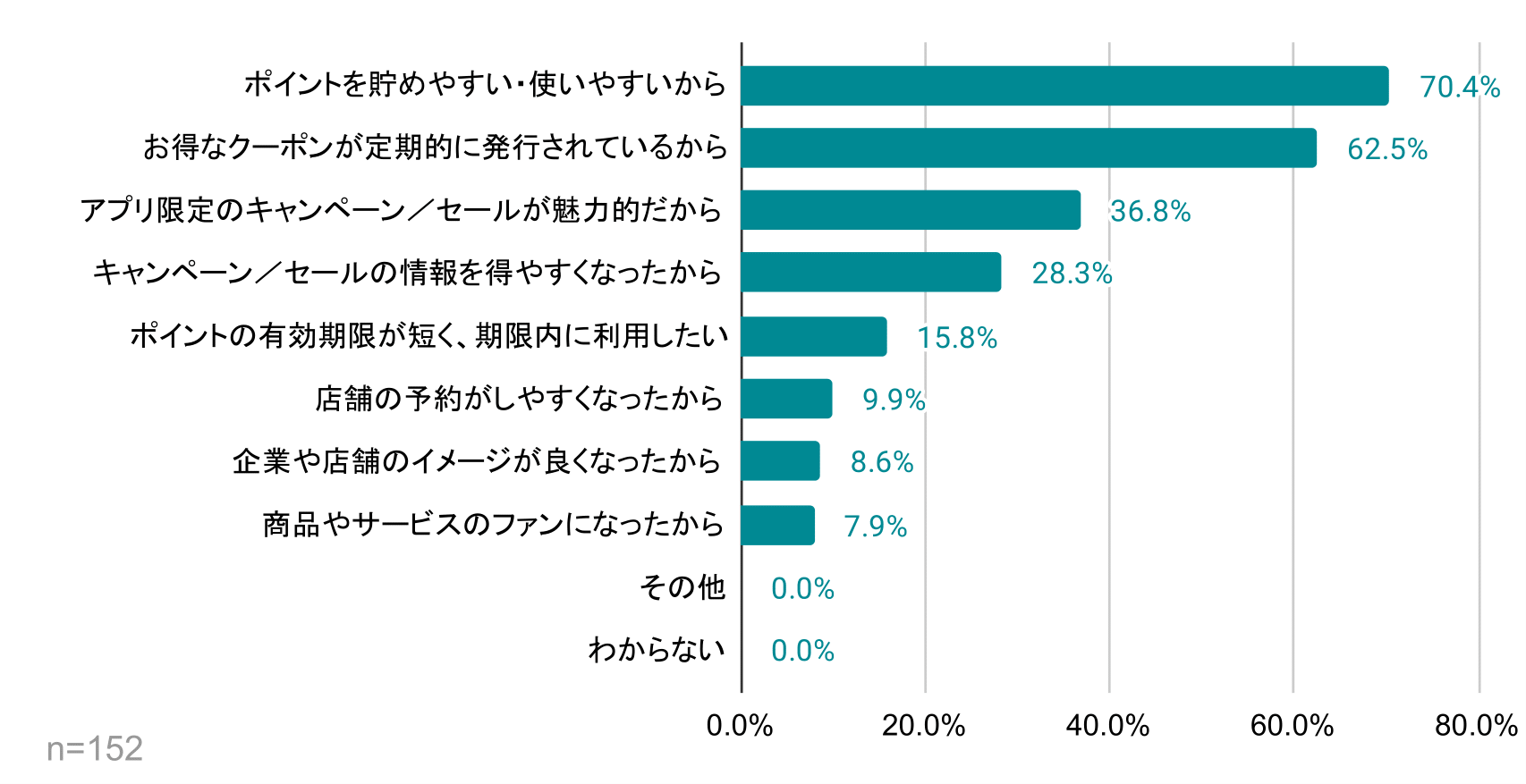 「来店頻度や商品の購入頻度が増えた」と回答した人に対してその理由を尋ねると、「ポイントを貯めやすい・使いやすいから」「クーポンが定期的に発行されているから」という理由が上位に挙がっています。