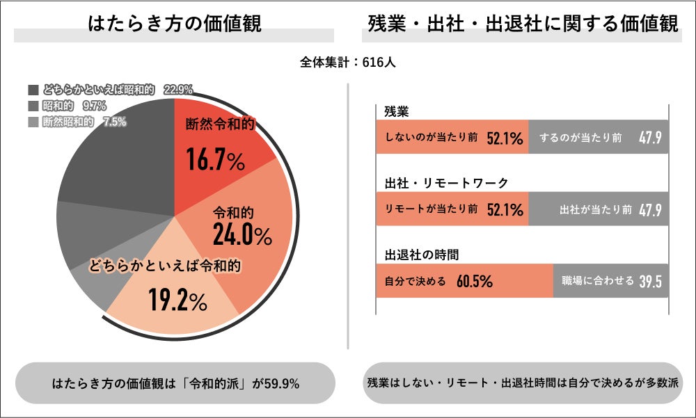回答者全体の616人にはたらき方の価値観を聞くと、「令和的な価値観派」が59.9%で過半数を占め、内訳は「とても令和的」16.7%、「令和的」24.0%、「どちらかといえば令和的」19.2%でした。また、はたらき方に関する項目ごとに聞くと、それぞれ「残業しないのが当たり前派」が52.1%、「リモートワークが当たり前派」が52.1%、「出退社時間は自分で決めるのが当たり前派」が60.5%となりました。