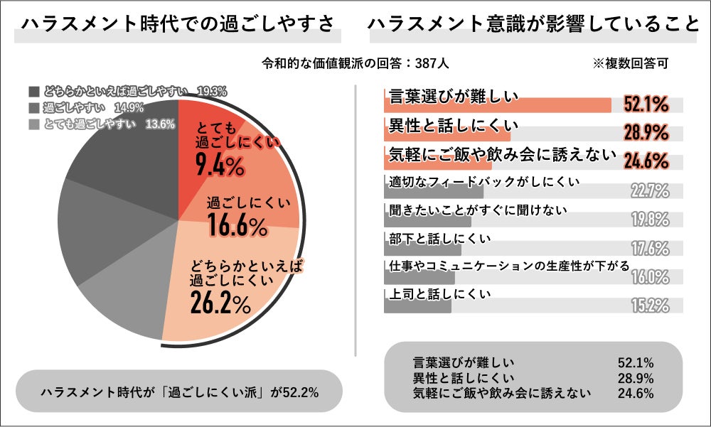 令和的な価値観を持つ387人に、ハラスメントの種類が増える時代での過ごしやすさを聞くと「過ごしにくい派」が52.2%で過半数を占め、内訳は「とても過ごしにくい」9.4%、「過ごしにくい」16.6%、「どちらかといえば過ごしにくい」26.2%でした。またハラスメント意識が影響していることを聞くと、「言葉選びが難しい」が52.1%で最多となり、「異性と話しにくい」が28.9%、「気軽にご飯や飲み会に誘えない」が24.6%でした。